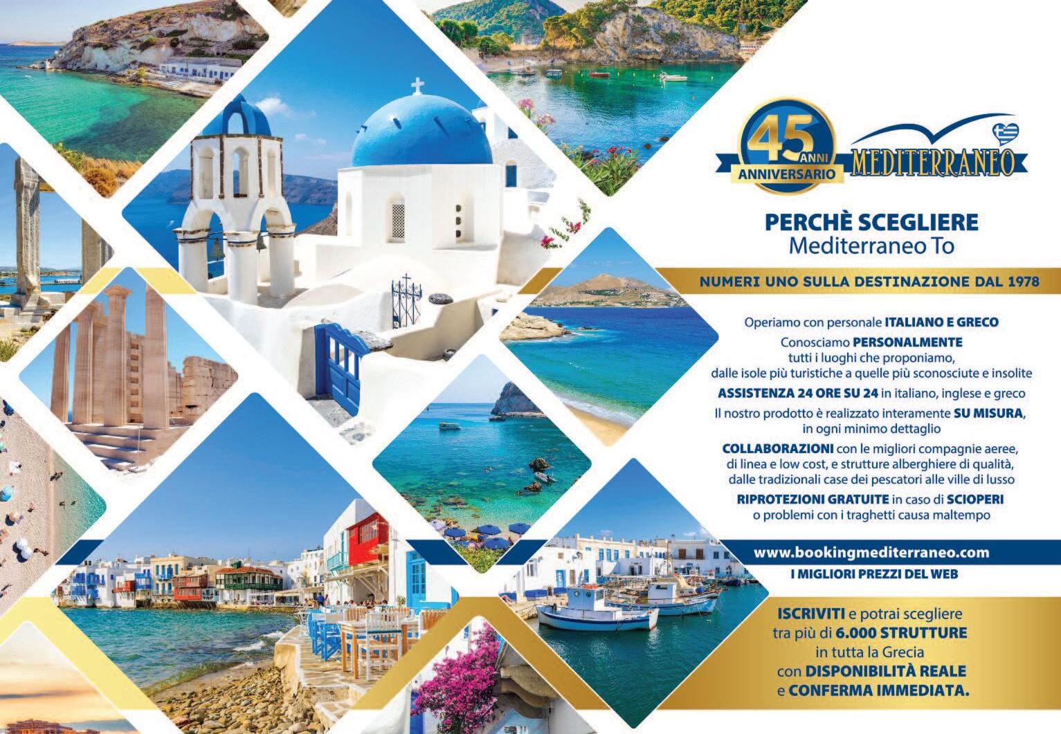 «Da 45 anni noi di Mediterraneo To facciamo conoscere ai nostri viaggiatori le bellezze della Grecia, anche quella più sconosciuta e nascosta, operando con grande passione e serietà - spiega l’amministratore, Aleksander Bibe - Prezzi flessibili? Aumenti improvvisi? Bagagli da aggiungere? Rischio scioperi? Grazie ai nostri voli charter da Bergamo e Milano per Creta, Karpathos, Zante, Mykonos, Santorini e Rodi possiamo assicurare prezzi convenienti, conferme immediate, nessun successivo supplemento carburante e la possibilità di creare combinati tra le isole Oltre a quelle più turistiche, conoscendo personalmente tutti i luoghi che proponiamo, possiamo creare anche viaggi su misura nelle località più suggestive e insolite Grazie al nostro portale www bookingmediterraneo com, le agenzie possono inoltre accedere al nostro back office e scegliere in autonomia, o su consiglio del nostro personale italiano e greco, tra più di 6 mila strutture in tutta la Grecia, con disponibilità reale e conferma immediata»