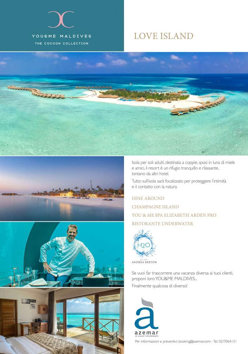 «Il nostro You & me Maldives è una piccola isola nell’atollo di Raa raggiungibile in 40-45 minuti di idrovolante - racconta l’a d Mariarosaria Campora - Si tratta di un resort da 109 camere, di cui 99 over water incluse nella nostra offerta entry level, mentre di solito alle Maldive, per soggiornare nelle palafitte, si paga un supplemento Ricca la proposta f&b grazie ai quattro ristoranti compresi nella nostra proposta dine around, con menu esclusivamente à la carte, che permette di pranzare o cenare in qualsiasi di questi locali senza alcun costo aggiuntivo: il The Sand, il Green Carpet, l’italiano La Pasta e un teppanyaki A questi si aggiunge poi l’H2o, primo ristorante sott’acqua gestito da uno chef stellato, Andrea Berton Il complesso è anche provvisto di una piscina lato tramonto con musica dal vivo e dj-set, soprattutto la sera, nonché di una spa brandizzata Elizabeth Arden Pro con le sale trattamenti situate in quattro palafitte over water A disposizione degli ospiti pure vari sport acquatici, un diving centre e una palestra»