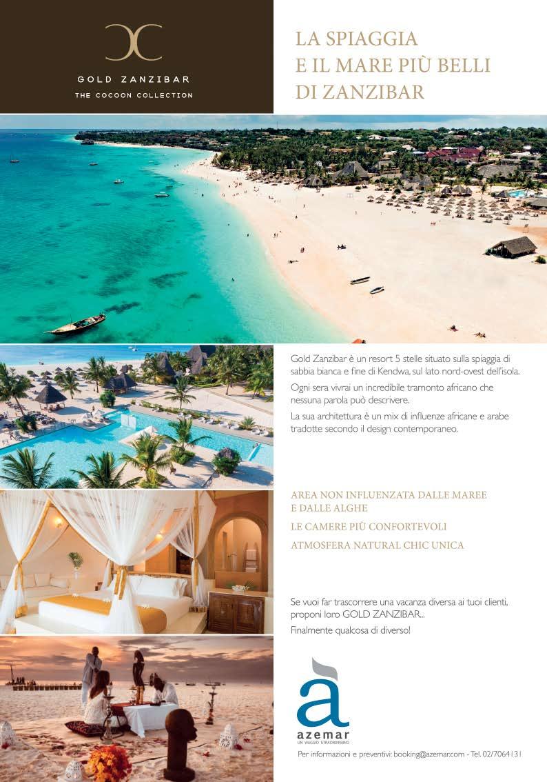 «In attesa del Bawe, prossima apertura del gruppo di casa The Cocoon Collection, a Zanzibar abbiamo due resort di proprietàspiega il key account, Loris Giusti -: il Gold Zanzibar Beach House & Spa da 77 camere con spa direttamente sulla spiaggia è situato nella zona più bella dell’isola Si trova a Kendwa, lungo la costa nord-ovest, che non è soggetta al fenomeno della bassa marea Qui si possono anche ammirare alcuni tra i più bei tramonti africani