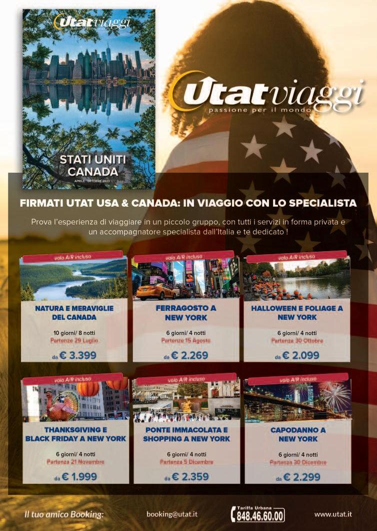 «Nasciamo nel 1934 come pionieri del turismo di gruppo Specialisti sugli Usa, offriamo una programmazione tra le più vaste in Italia Il catalogo 2023 include una cinquantina di tour di gruppo a partenza garantita con guida in italiano, 70 itinerari fly & drive, partenze speciali con accompagnatore, ma anche viaggi tematici, soggiorni nei ranch, in alberghi storici e nelle piantagioni, glamping e viaggi di nozze - spiega la pm, Arianna Pradella - I nostri viaggi più richiesti sono i Firmati Utat, per cui la programmazione 2023 prevede partenze mensili: il Grande West Firmato Utat, per visitare la California e i Parchi, il Triangolo dell’Est, per il classico 8 giorni sulla costa Atlantica, il Canada Orientale oppure il New York in 6 giorni, per visitare in modo nuovo la città Già disponibili anche i viaggi per Halloween, Thanksgiving, Immacolata e Capodanno Si tratta di tour con contenuti speciali e insoliti, perfetti anche per i repeaters In più sono accompagnati dal nostro specialista Stati Uniti, che garantisce un’esperienza totalmente immersiva e speciale»