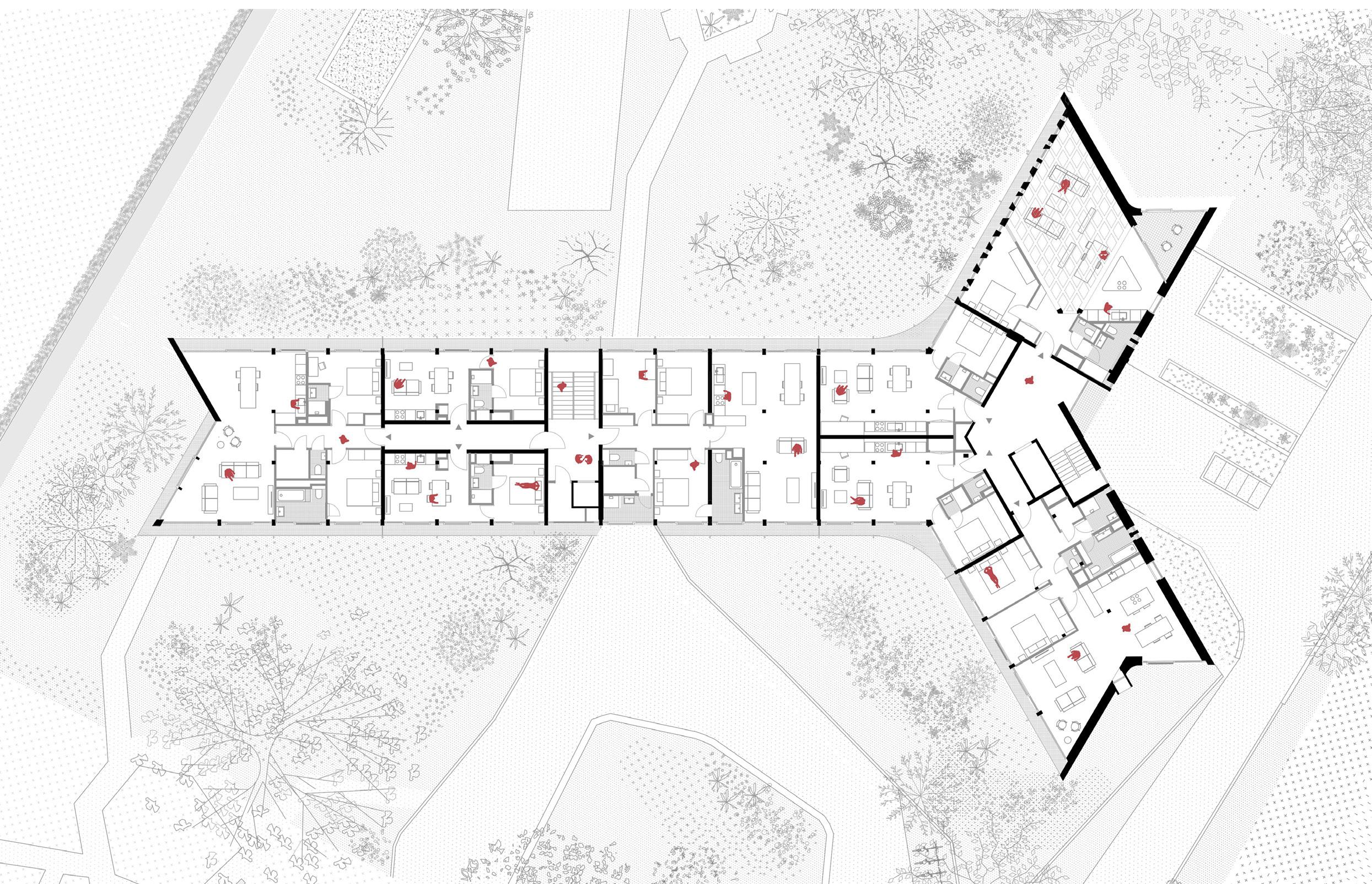 Pour dialoguer avec ce contexte, une forme en ‘Y’ a été choisie, évitant toute frontalité directe et optimisant l’orientation des espaces.
