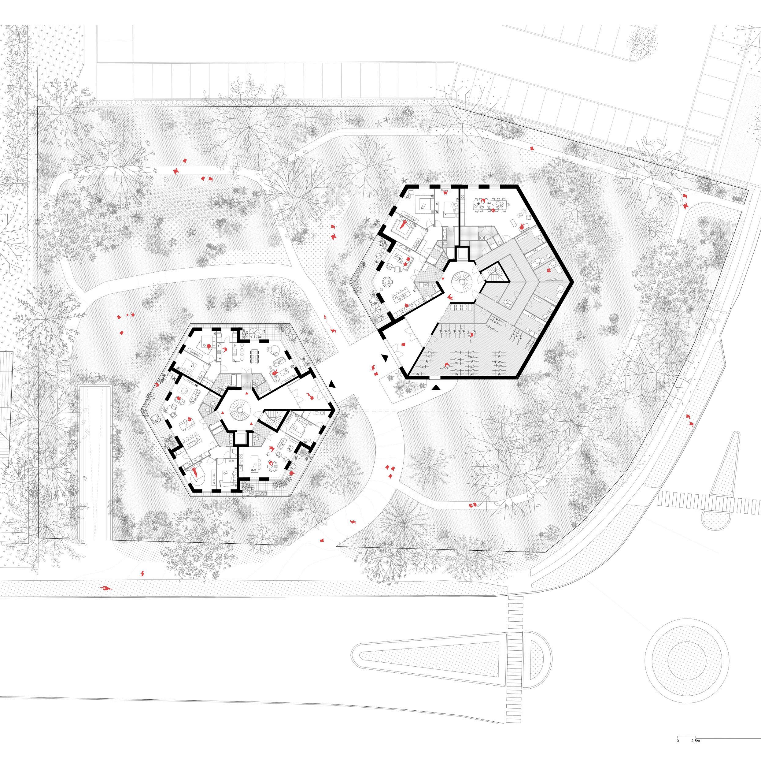 (2) Remplacement du pavillon existant : le pavillon situé à l’arrière du site est remplacé par un nouveau bâtiment, dont l’architecture répond mieux aux besoins du centre médical, améliorant ainsi la qualité des services. Ce nouveau pavillon sera intégré à un aménagement paysager reliant le parc, assurant la continuité avec les espaces verts environnants.