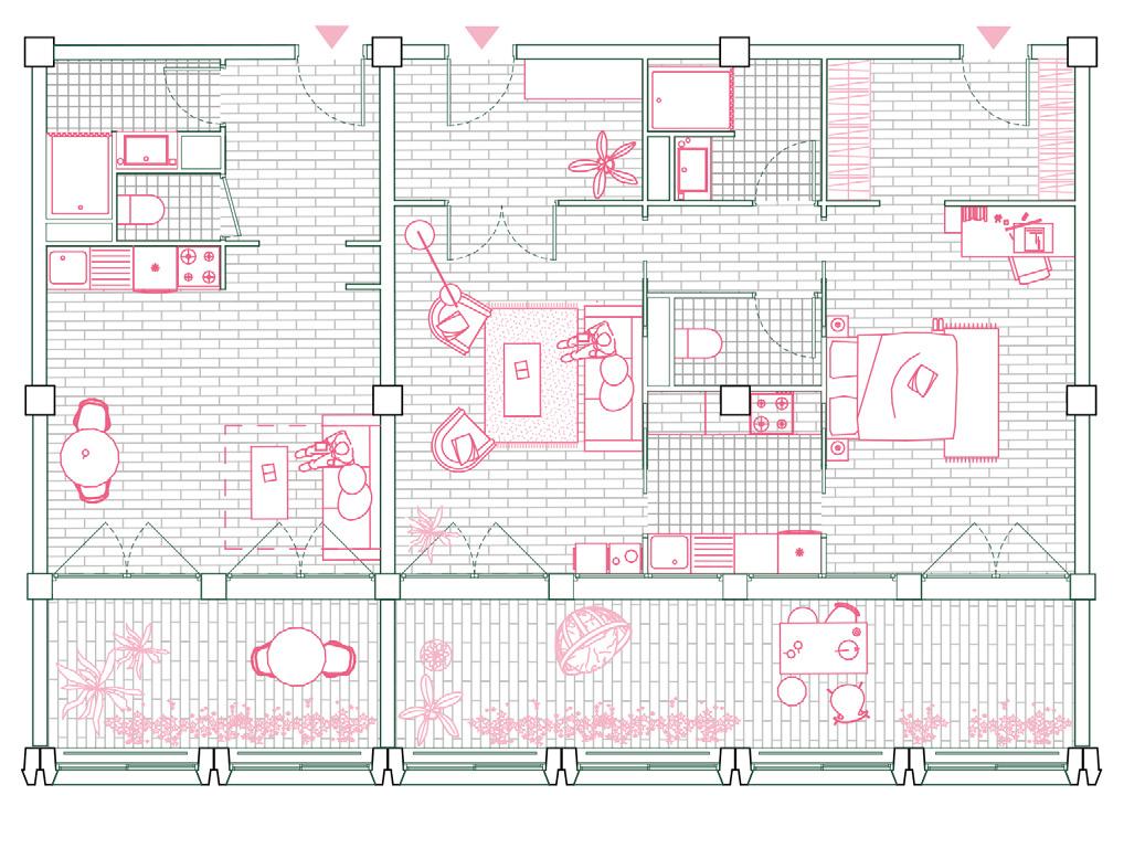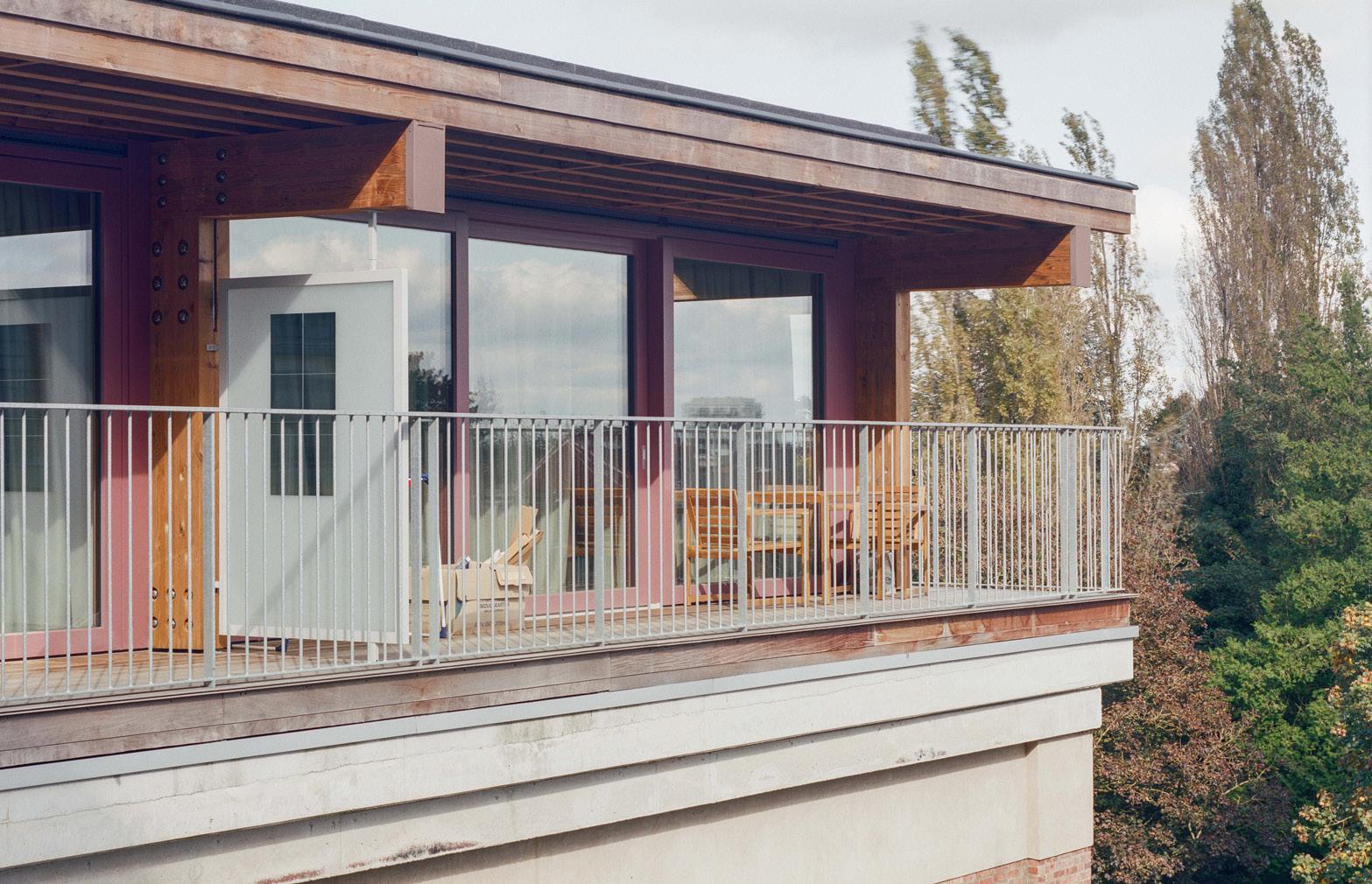 Ce langage se décline : sur les bâtiments rénovés, différenciçant le déja là des nouveux bâtiments. Dans la continuité de cette méthode, le nouvel espace communautaire se démarque et démontre sa nouvelle fonction, grâce à son langage assumé de briques blanches et ses menuiseries thermolaquées rouge. Ainsi, toute l’expression architecturale du projet œuvre à la mise en scène de ses habitants, elle vise à leur offrir des espaces appropriables qui les place au premier plan de l’architecture qu’ils habitent.