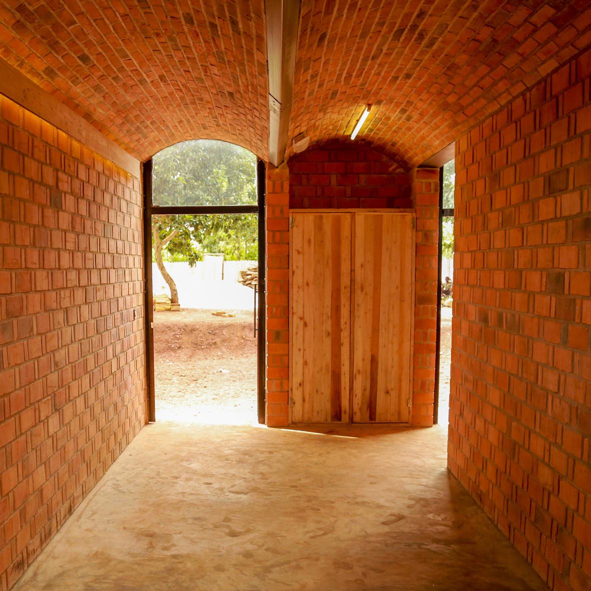 La structure porteuse verticale est en maçonnerie de terre cuite locale (avec procédé de combustion à base de biomasse) dont le format et l’appareillage permettent une économie de 50% de ciment par rapport au système classique. Le creux central du mur présente des avantages d’isolation contre la surchauffe, de passage de câbles et de conduites, et de réservations pour le chaînage en béton armé, la brique servant de coffrage perdu.