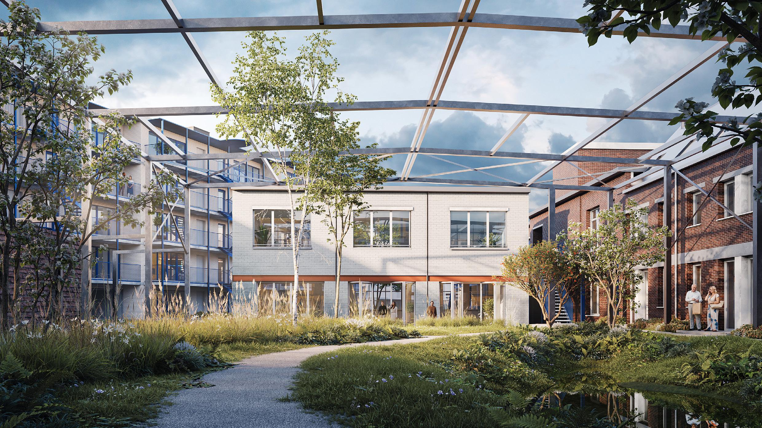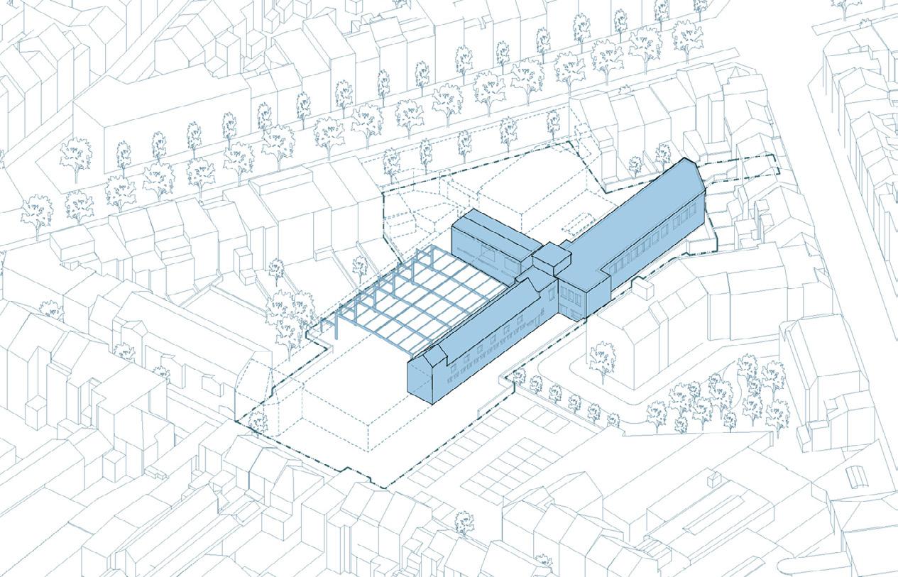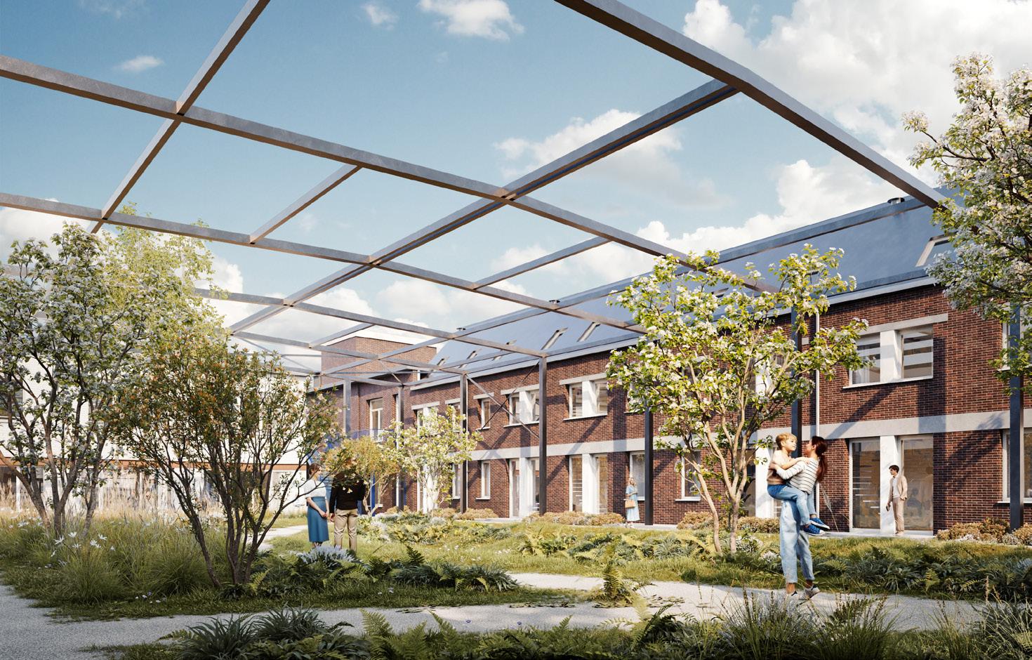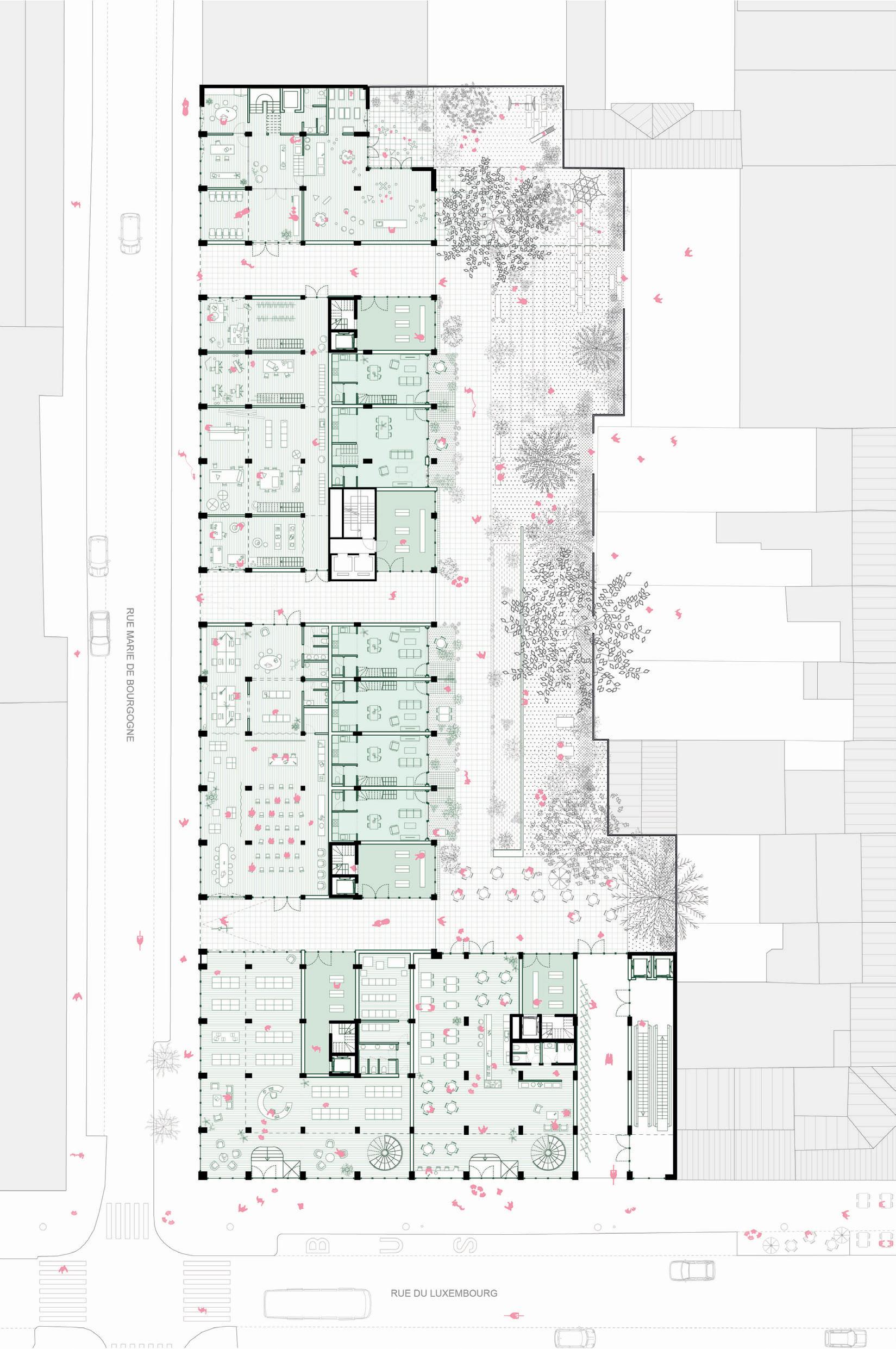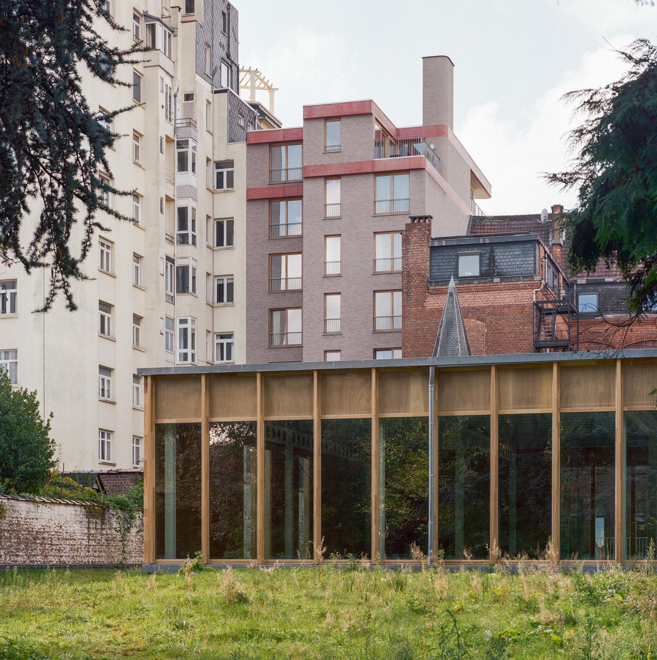 Le projet s’insère dans un intérieur d’îlot dense à Jette, le long de l’avenue Carton de Wiart. Il vise à libérer le sol pour créer un jardin collectif tout en conservant des éléments du bâti industriel existant. Trois bâtiments à rue redéfinissent le front bâti, tandis que trois entrepôts aux structures variées sont préservés à l’intérieur de l’îlot, témoignant de la mémoire du lieu.