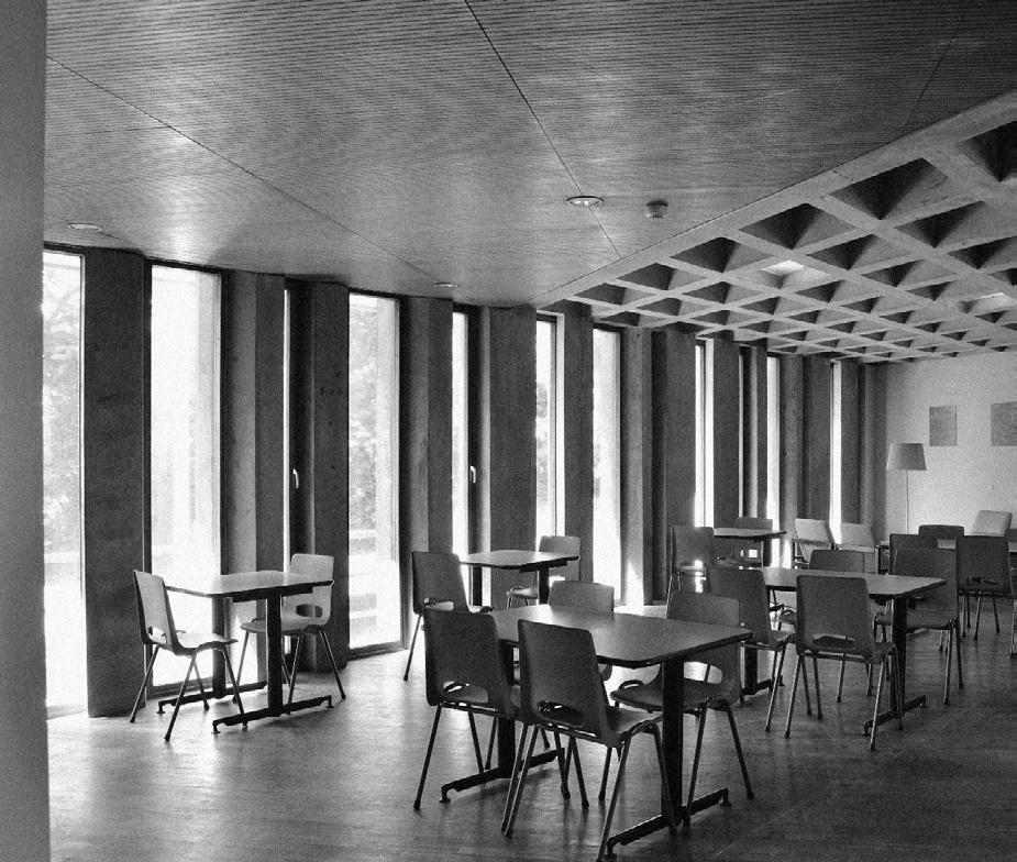 Des murs de soutènement, longés d’une large rampe, forment la transition de la déclivité du terrain pour rejoindre l’entrée. Cette dernière est traversante, relie la cour avec le jardin et sépare les classes des espaces de services et des logements des enseignants.
