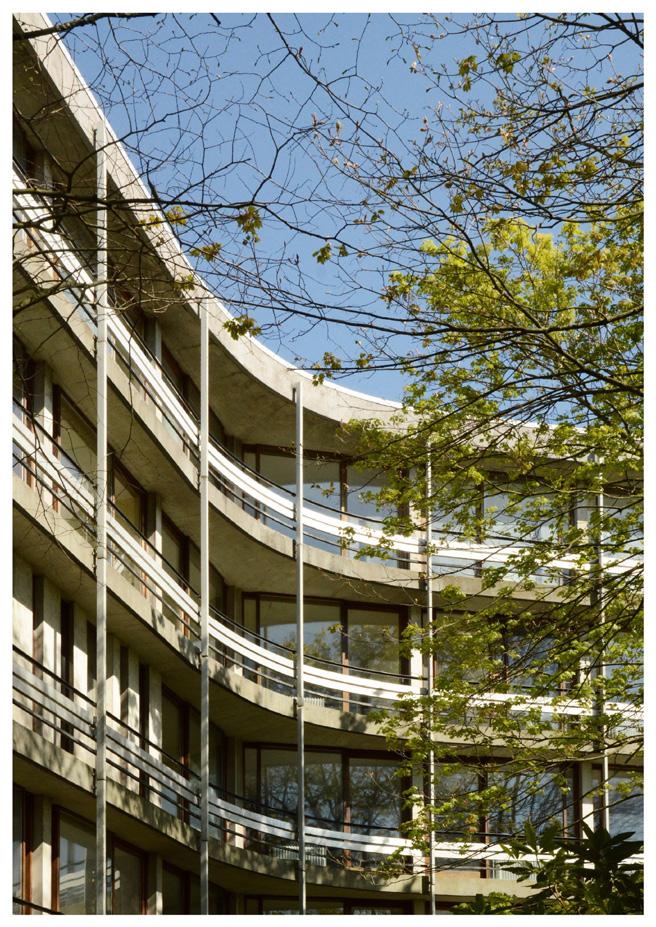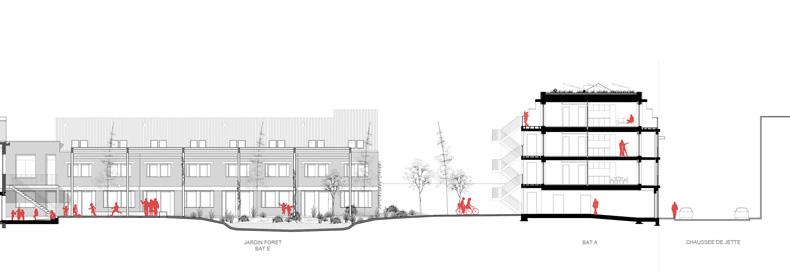 La radicalité des circulations apporte de la cohérence à cette multiplicité de situations bâties. Toujours positionnées à l’extérieur, les circulations se situent à chaque fois du côté intérieur de l’îlot. Elles créent une transition entre les sphères collectives et privées en gardant un regard constant sur le jardin. Par différents systèmes, tels que cages d’escaliers en façade, coursives extérieures, elles deviennent des belvédères sur le jardin collectif.