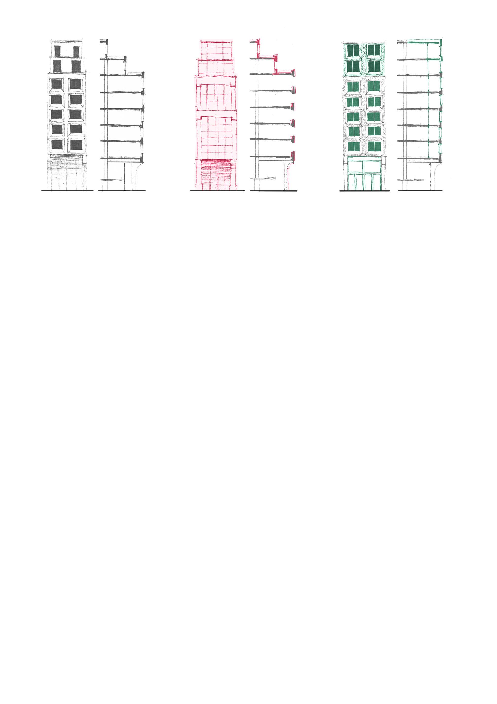 (3) Création d’un immeuble résidentiel : un immeuble d’appartements de sept étages est construit entre les deux pignons, fermant ainsi l’îlot. Ce volume agit comme un pont géométrique et chromatique entre les bâtiments adjacents, corrigeant le déséquilibre existant. Il affirme son rôle central et complète la séquence urbaine.
