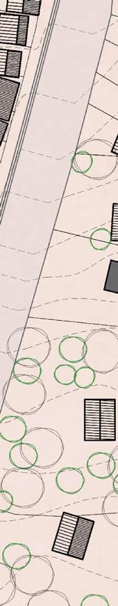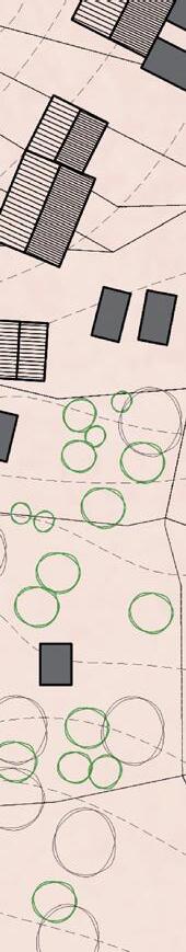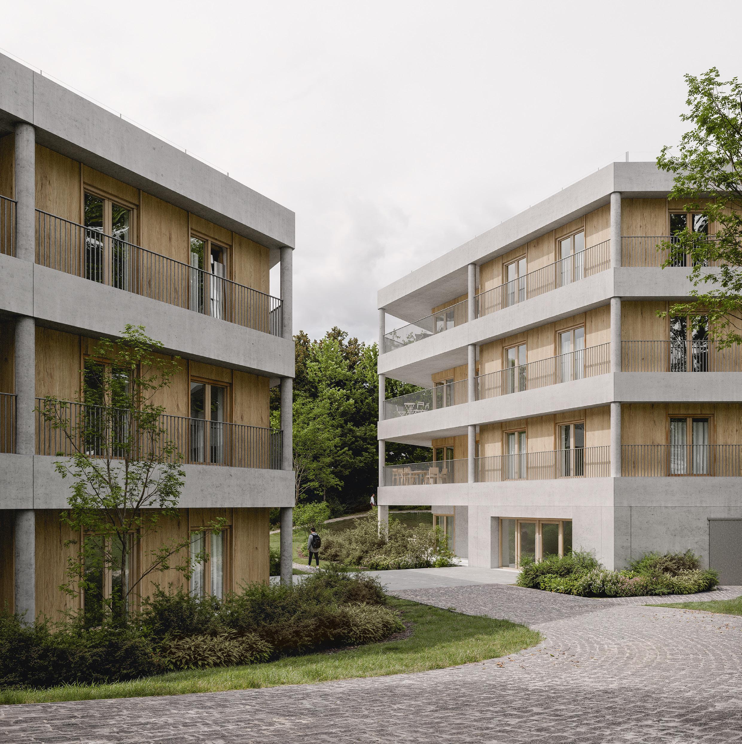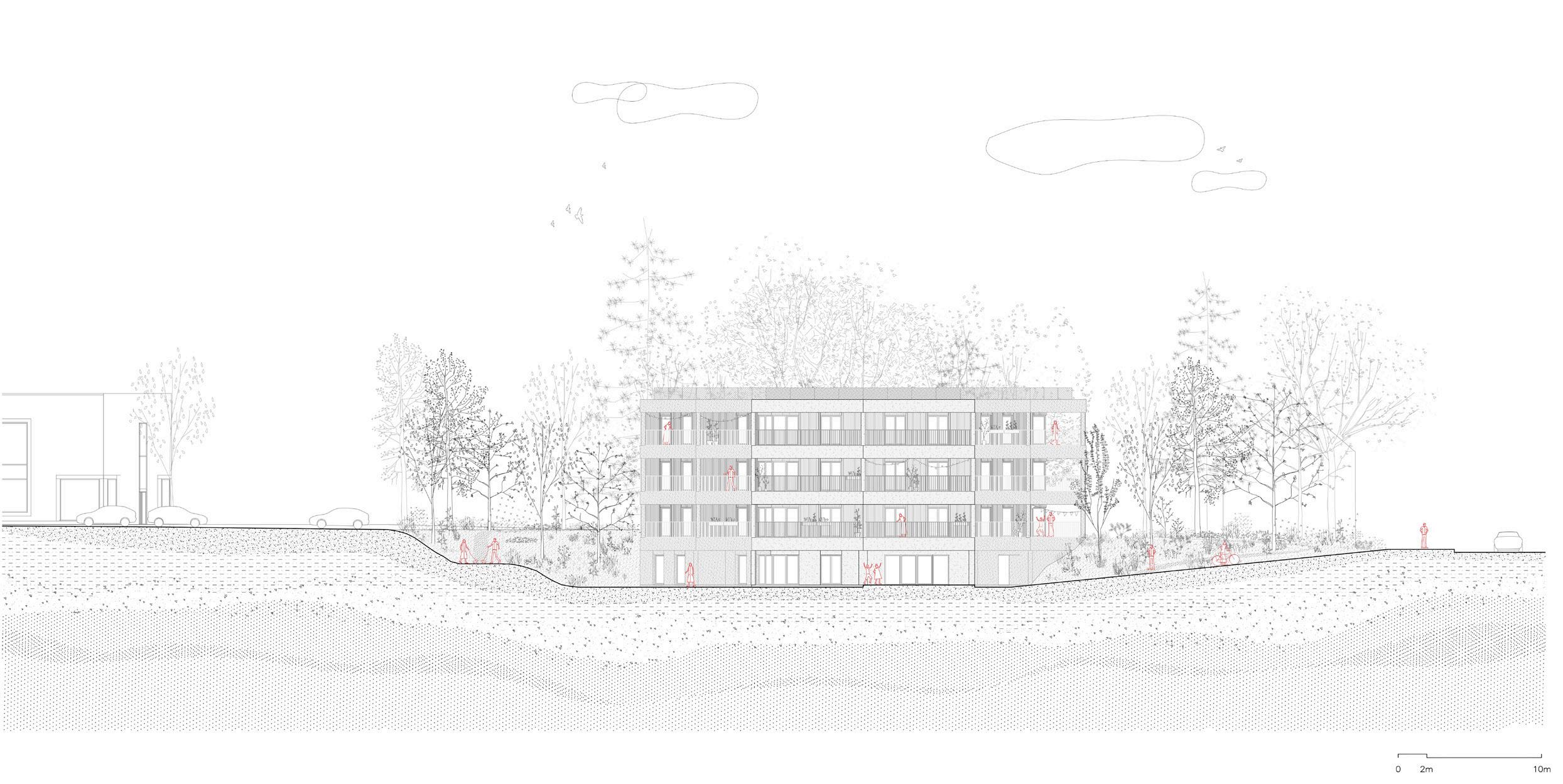 L’intervention y propose la construction de deux bâtiments bas –9 et 10 unités – intégrés dans un parc privé largement végétalisé. Implantés en retrait dans la topographie, les immeubles s’inscrivent discrètement dans le paysage, derrière une ceinture boisée renforcée. Leur morphologie hexagonale favorise des vues variées, tout en assurant une compacité favorable au rapport surface/emprise.