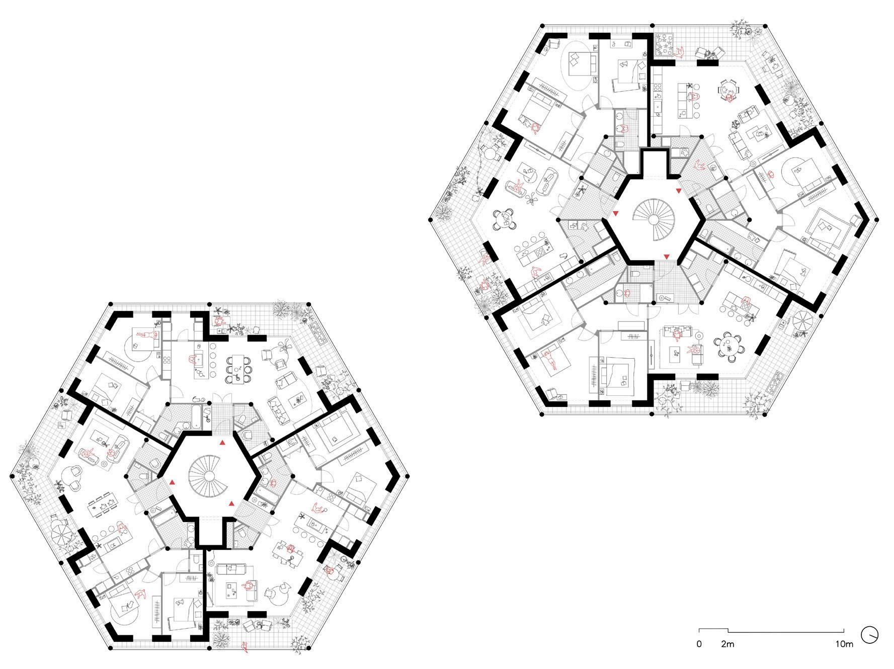 Les 106 logements, aux typologies variées, s’adaptent à différents modes de vie. L’organi sation en cinq entités distinctes favorise l’appro priation par les habitants, tout en assurant une cohérence d’ensemble.