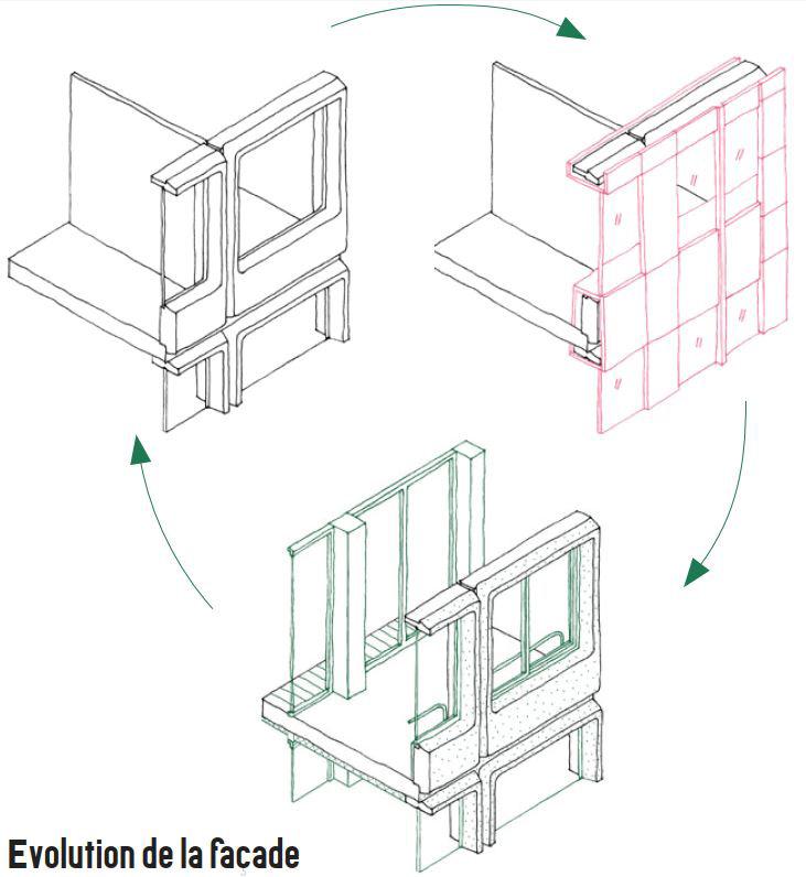 L’intervention repose sur la valorisation du bâti ex istant, conservant la structure en béton, révèlant les façades d’origine et réintégrant les matériaux issus de la rénovation. Le projet s’inscrit dans une logique de circularité, limitant les démolitions et favorisant la réversibilité des usages.