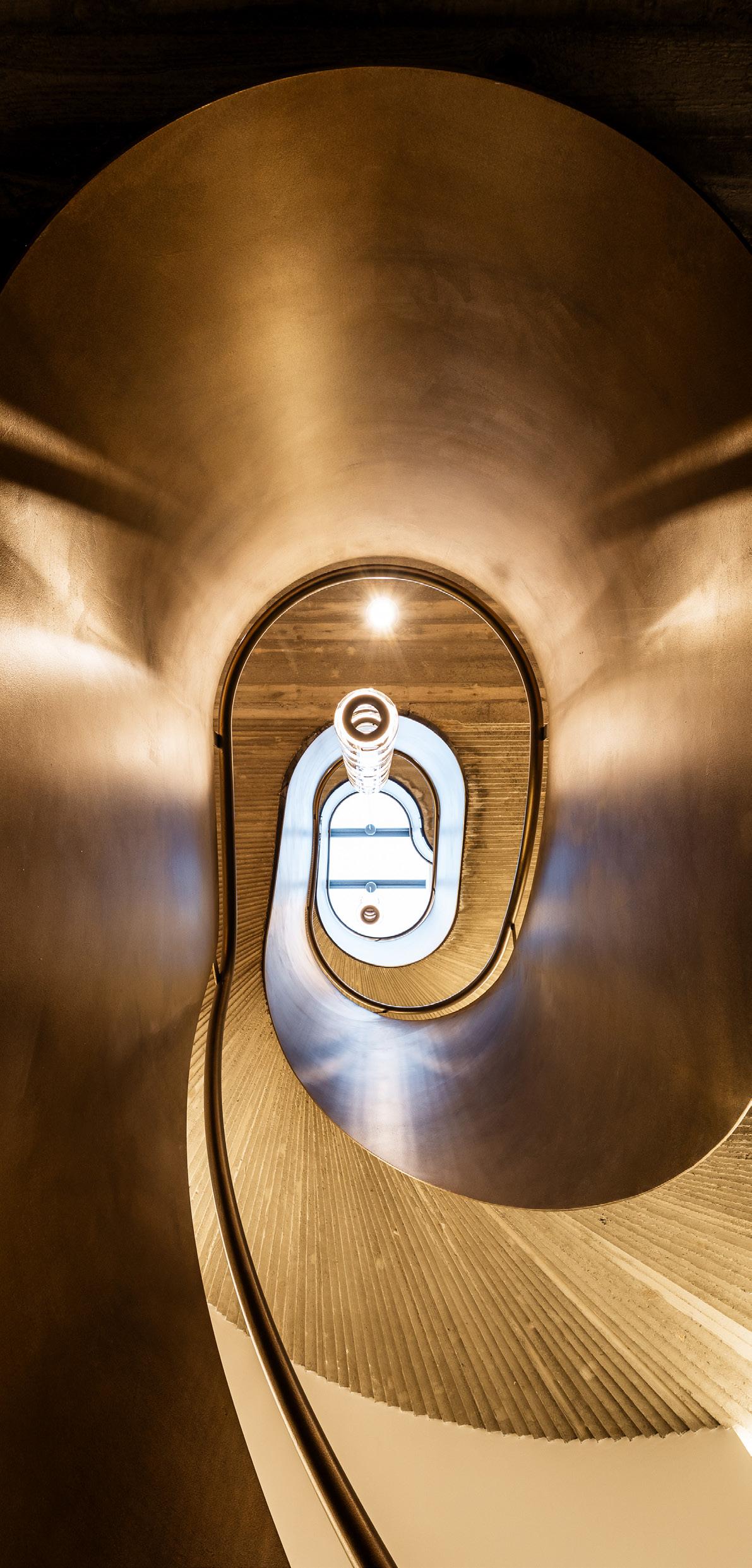La pièce maitraisse du projet est l’escalier central réalisé en béton apparent voligé en sous-face, avec un garde-corps hélicoïdal en acier patiné. Cette même matérialité se retrouve à divers endroits du projet et permet ainsi d’homogénéiser l’écrite architecturale intérieure.