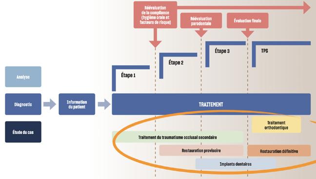 Lâobjectif de ce travail a Ă©tĂ© dâapporter une rĂ©flexion sur la coordination des soins et la communication entre les acteurs intervenant dans le traitement global des parodontites de stade IV. En effet, comme le recommande lâEFP dans son guide de pratique clinique (1) illustrĂ© dans la figure N°1, les thĂ©rapeutiques associĂ©es doivent ĂȘtre rĂ©alisĂ©es Ă des moments clefs de la thĂ©rapeutique parodontale par le chirurgien-dentiste omnipraticien.