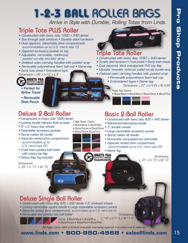 Constructed w/heavy duty 1680 denier • Constructed with heavy duty 600 + 840 denier Locking handle retracts flush to base 2-Ball Roller Colors: • Reinforced telescoping handle • Black/Black • Black/Blue 5” x 2” heavy duty wheels • Black/Purple • Black/Silver • 3” durable wheels Expandable accessory pockets • Large expandable accessory pocket • Black/Red • Black/Pink Sturdy rubber lift handle • Sturdy rubber lift handle Separate vented shoe compartment, • Removable and padded two ball holder accommodates up to • Separate vented shoe compartment, U.S. men’s size 20 accommodates up to U.S. men’s size 20 2-ball foam padded ball holder • Name Tag with unique top flap MEETS FAA Dimensions: Carry-On Luggage Deluxe Bag Tag Included Requirements L: 21” x H: 15” x W: 13” Dimensions: L: 23” x H: 17” x W: 13”