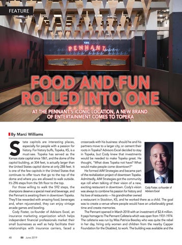 crossroads with his business: should he and his partners move to a larger city, or cement their roots in Topeka? Advisors Excel decided to stay in Topeka, but Cody knew that investments would be needed to make Topeka great. He thought, “What does Topeka not have? What would make people come downtown?” He formed AIM Strategies and became part of the revitalization project of downtown Topeka. Admittedly, AIM Strategies got the community eye roll when talking of their vision of a new, exciting restaurant in downtown. Cody’s vision Cody Foster, co-founder of was always to combine his passion for history and Advisors Excel his love of restaurants — his grandmother owned a restaurant in Stockton, KS, and he worked there as a child. The goal was to create a venue where people would have an unbelievably great time and create memories. The Pennant opened in March 2018 with an investment of $2.4 million. It pays homage to The Pennant Cafeteria which was open from 1931-1974. The cafeteria was run by Miss Patricia Beezley who was quite the rebel in her day, hiring only women and children from the nearby Capper Foundation for the Disabled, to work. The building was available and the