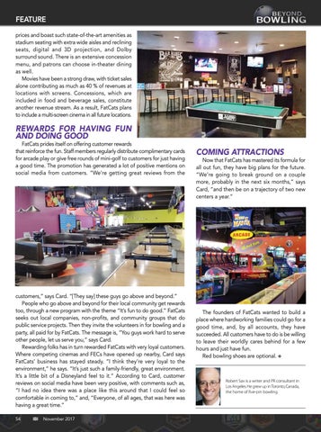 customers,” says Card. “[They say] these guys go above and beyond.” People who go above and beyond for their local community get rewards too, through a new program with the theme “It’s fun to do good.” FatCats seeks out local companies, non-profits, and community groups that do public service projects. Then they invite the volunteers in for bowling and a party, all paid for by FatCats. The message is, “You guys work hard to serve other people, let us serve you,” says Card. Rewarding folks has in turn rewarded FatCats with very loyal customers. Where competing cinemas and FECs have opened up nearby, Card says FatCats’ business has stayed steady. “I think they’re very loyal to the environment,” he says. “It’s just such a family-friendly, great environment. It’s a little bit of a Disneyland feel to it.” According to Card, customer reviews on social media have been very positive, with comments such as, “I had no idea there was a place like this around that I could feel so comfortable in coming to,” and, “Everyone, of all ages, that was here was having a great time.” 54
