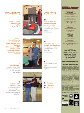HOTLINE: 888-424-2695 SUBSCRIPTION RATES: One copy of International Bowling Industry is sent free to every bowling center, independently owned pro shop and collegiate bowling center in the U.S., and every military bowling center and pro shop worldwide. Publisher reserves the right to provide free subscriptions to those individuals who meet publication qualifications. Additional subscriptions may be purchased for delivery in the U.S. for $50 per year. Subscriptions for Canada and Mexico are $65 per year, all other foreign subscriptions are $80 per year. All foreign subscriptions should be paid in U.S. funds using International Money Orders. POSTMASTER: Please send new as well as old address to International Bowling Industry, 13245 Riverside Drive, Suite 501, Sherman Oaks, CA 91423 USA. If possible, please furnish address mailing label. Printed in U.S.A. Copyright 2012, B2B Media, Inc. No part of this magazine may be reprinted without the publisher’s permission.
