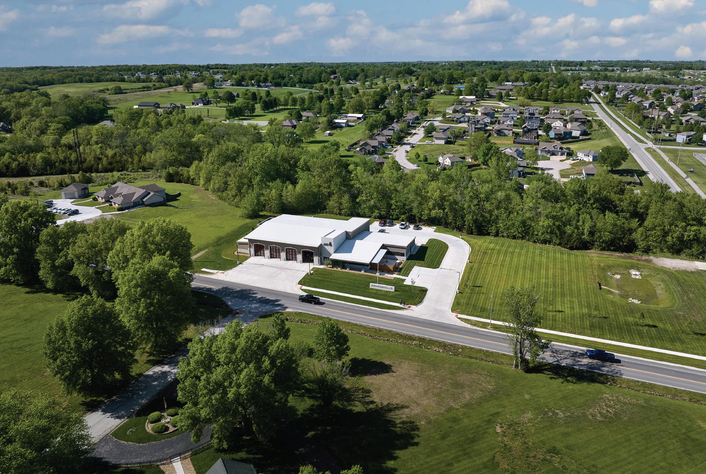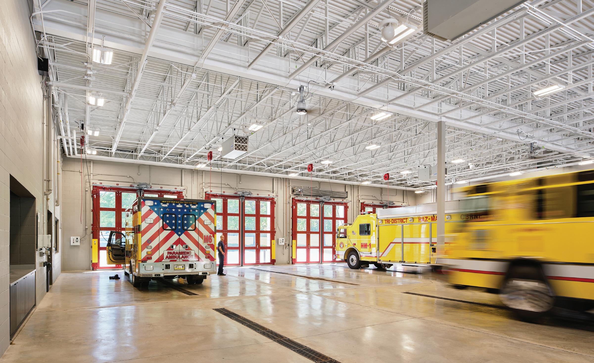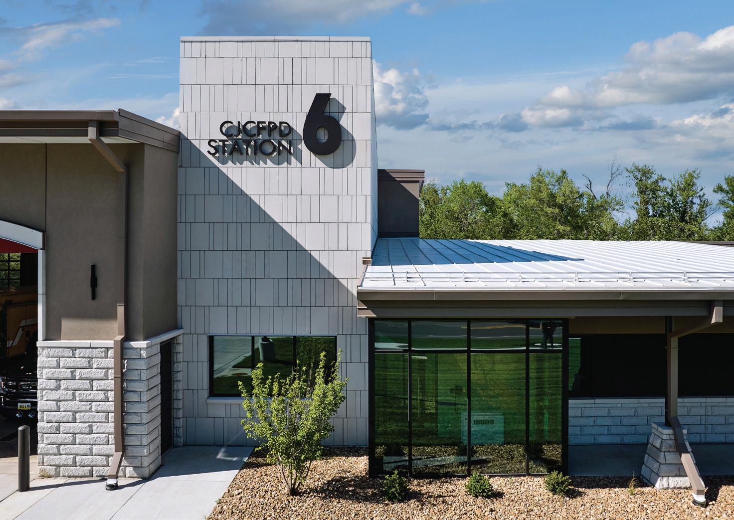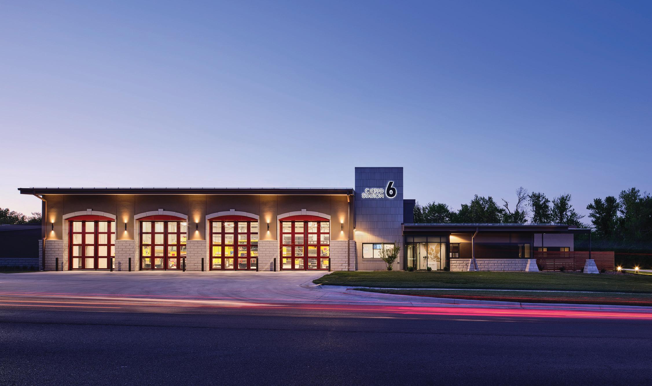 SFS Architecture, as part of a design-build team, collaborated with the Central Jackson County Fire Protection District to design and construct the new two-company Fire Station 6. Major program elements include four double deep drive through bays that accommodate heavy rescue, 24/7-hour living quarters for up to eight first responders with gender neutral bathrooms and an open floor concept for communal living areas including tiered dayroom seating that doubles as a training space. Each first responder on shift has a private sleeping room with controllable access to natural light and individual thermal comfort. The three-shift lockers are directly adjacent to each individual sleeping room and accessible to off-shift staff while maintaining occupant privacy in the sleep room. A Battalion Chief’s suite is featured at the station. The apparatus bay is equipped with heated bay floors, four-fold exiting doors, and redundant air filtration systems for improved energy efficiency, safety, and contaminant control respectively.