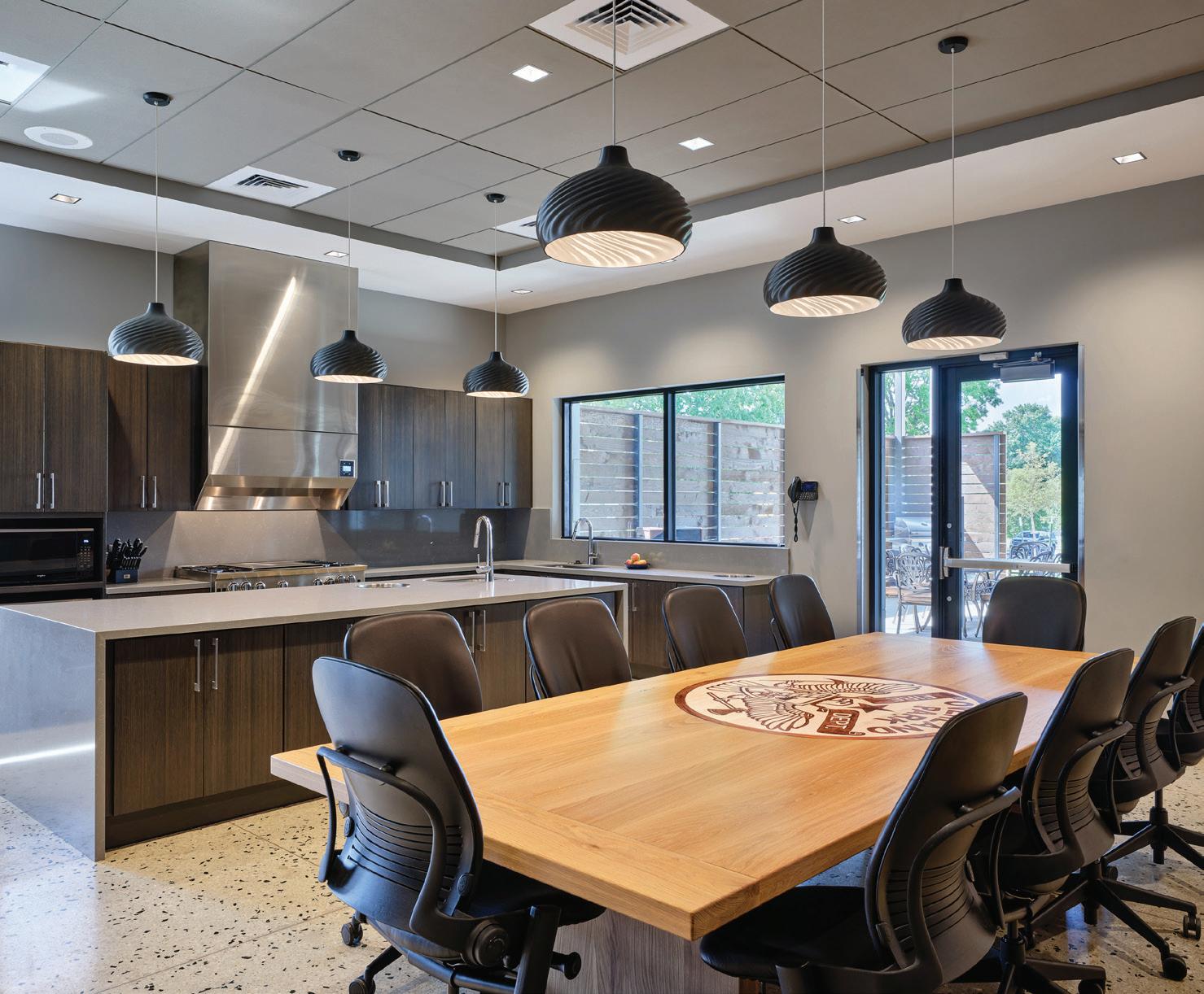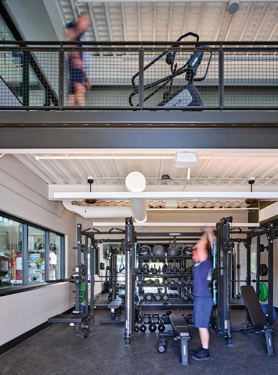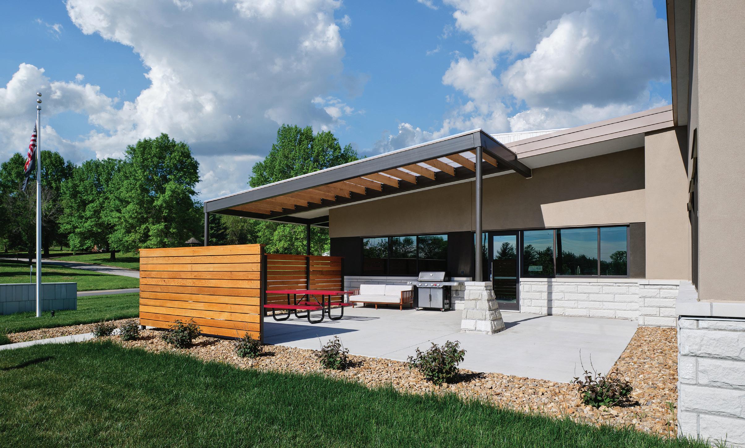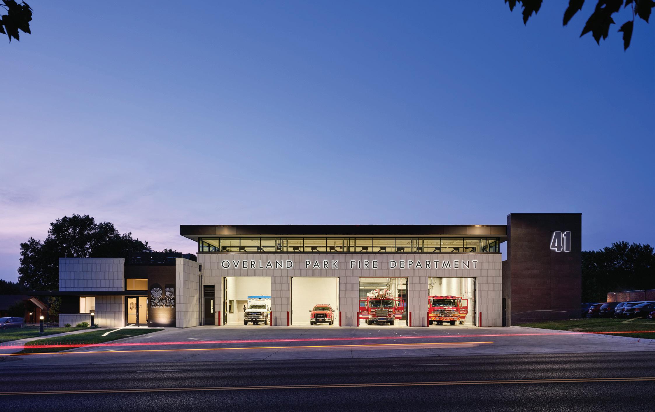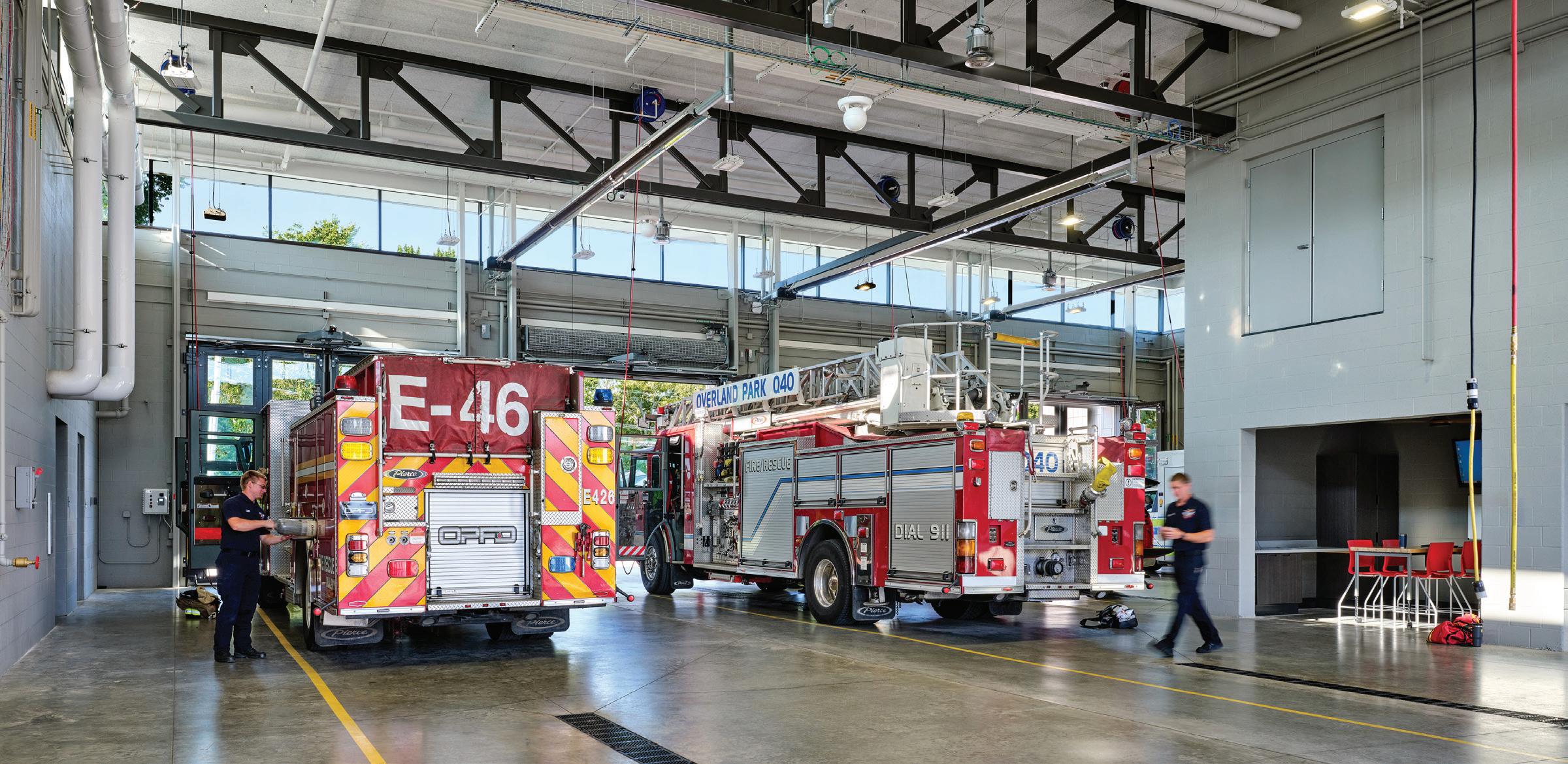 The new station is a four-bay (includes 2 double depth drive through bays), three-company station with twelve private sleep rooms, gender-neutral toilet and shower facilities and a two-story workout facility that provides direct access to the exterior for expanded training options. A sheltered but inviting patio area is directly accessed from the open dining and kitchen spaces. The new station includes accommodations for Johnson County Med-Act ambulance service. With the department’s commitment to health and wellness for its first responders, station 41 is designed to control the movement of contamination throughout the station with transition spaces that separate the atmosphere between clean and higher hazard spaces and provide opportunities for handwashing and face washing.