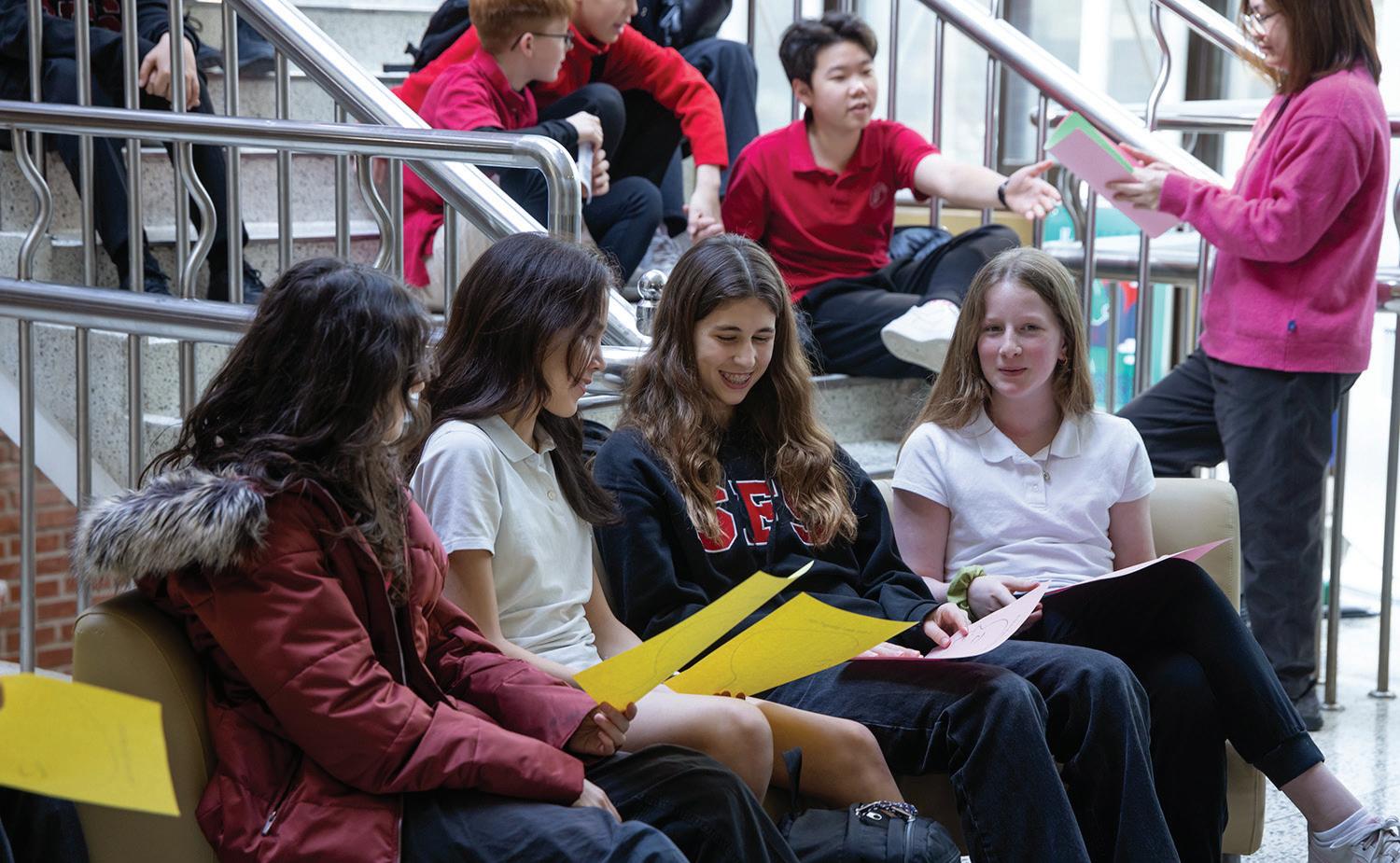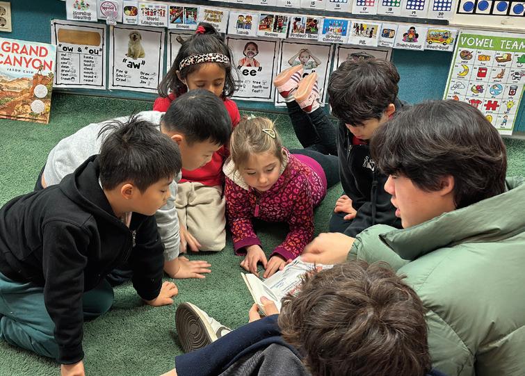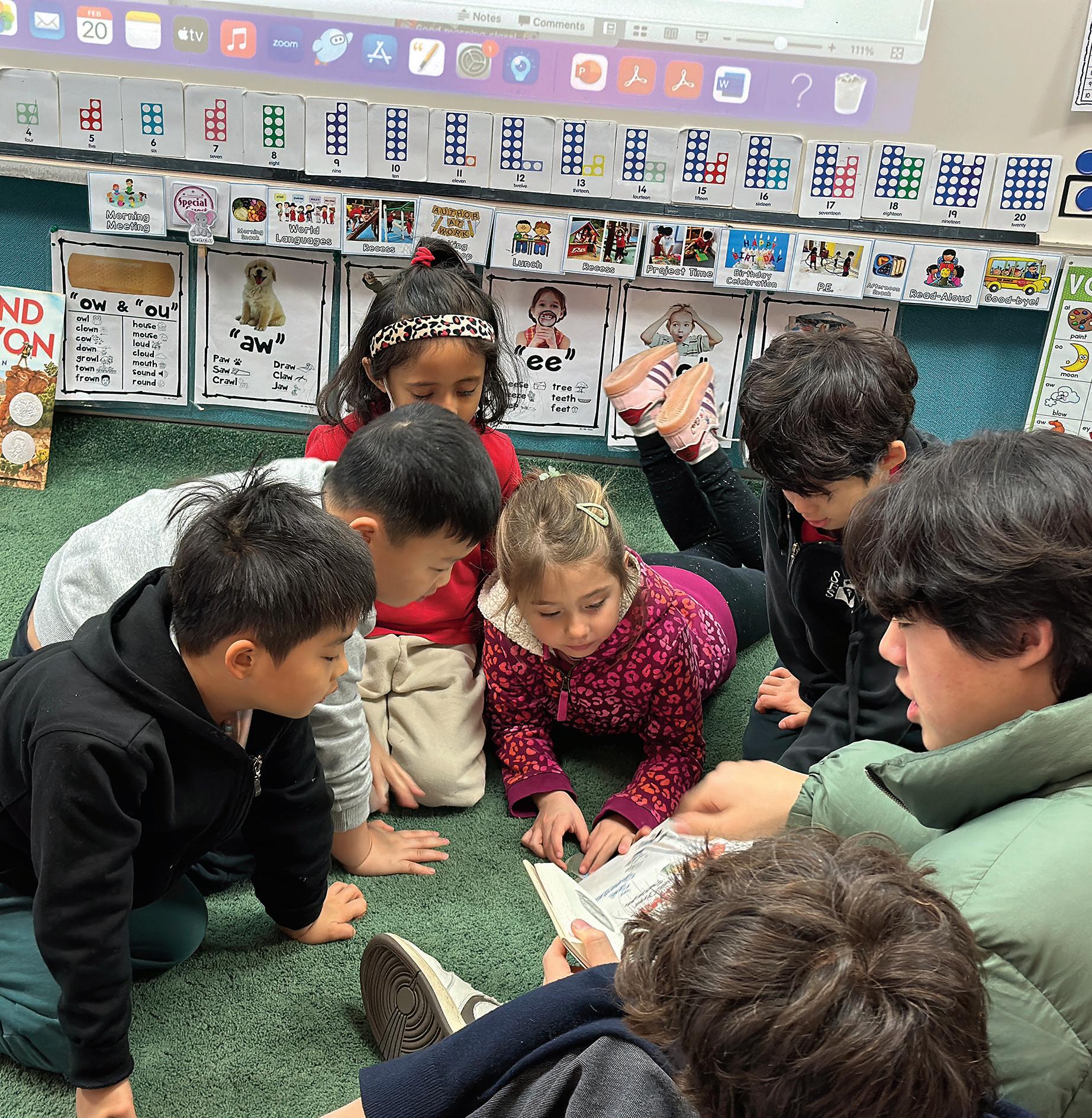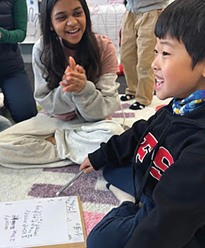 Kindergarten and Grade 9 students connect through poetry and stories, building community and creating heartwarming moments across ages.