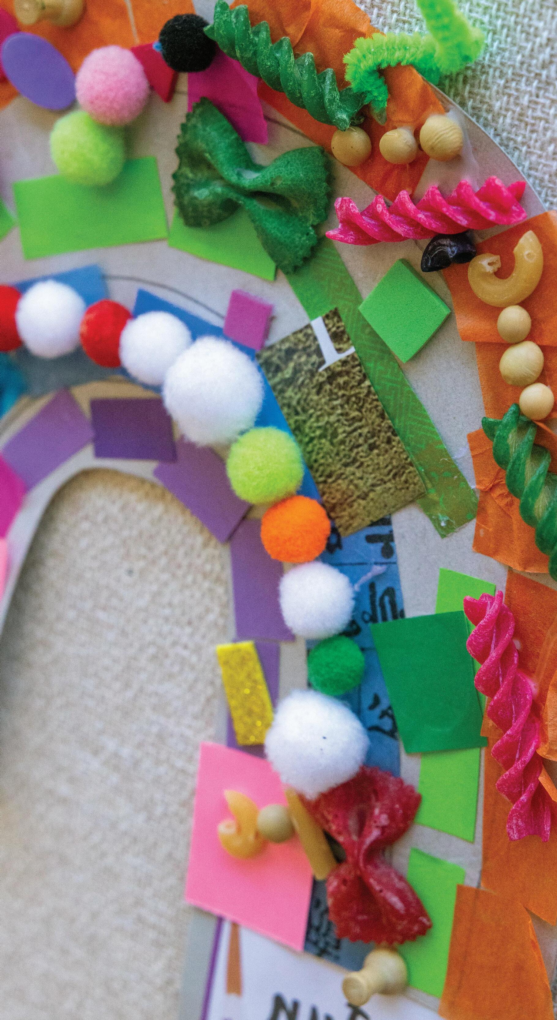 Rainbow Collage by Pre-K3 students, created using materials such as origami paper, shaped foam, pompoms, and colored pasta — a delightful way to learn about color order, recognition, and matching. The activity also strengthens