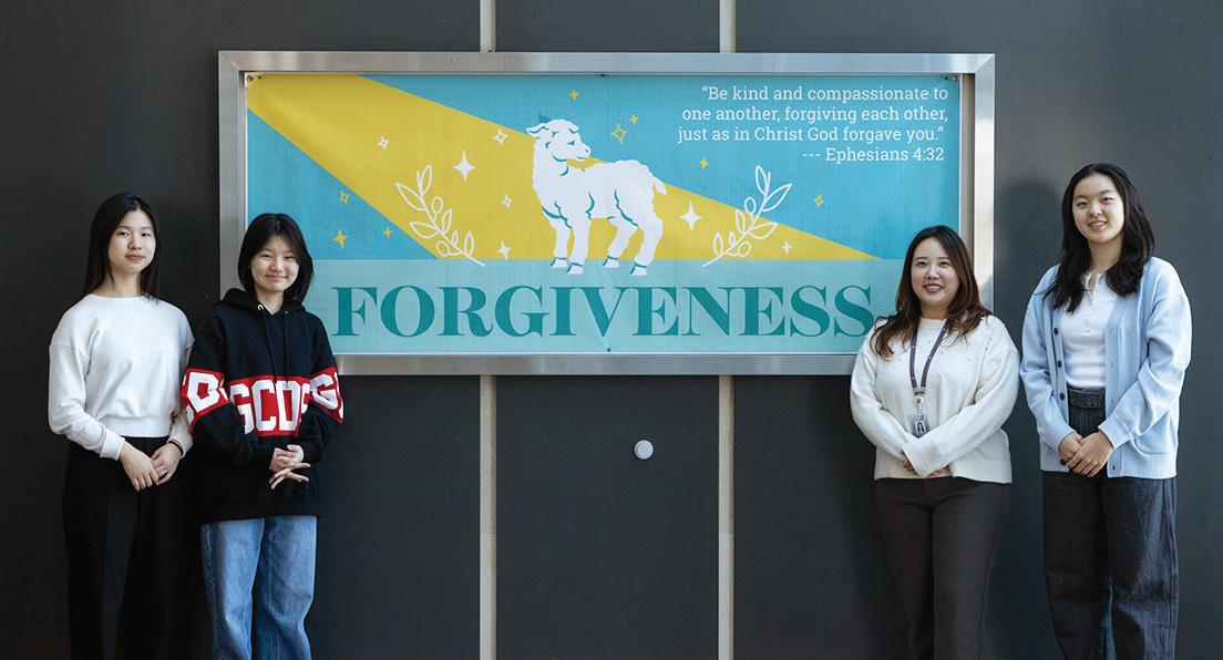 The bell rings, and Elementary School students rush into the Atrium, passing the Christ-Like Attitude poster for the month: LOVE, designed by high school students.