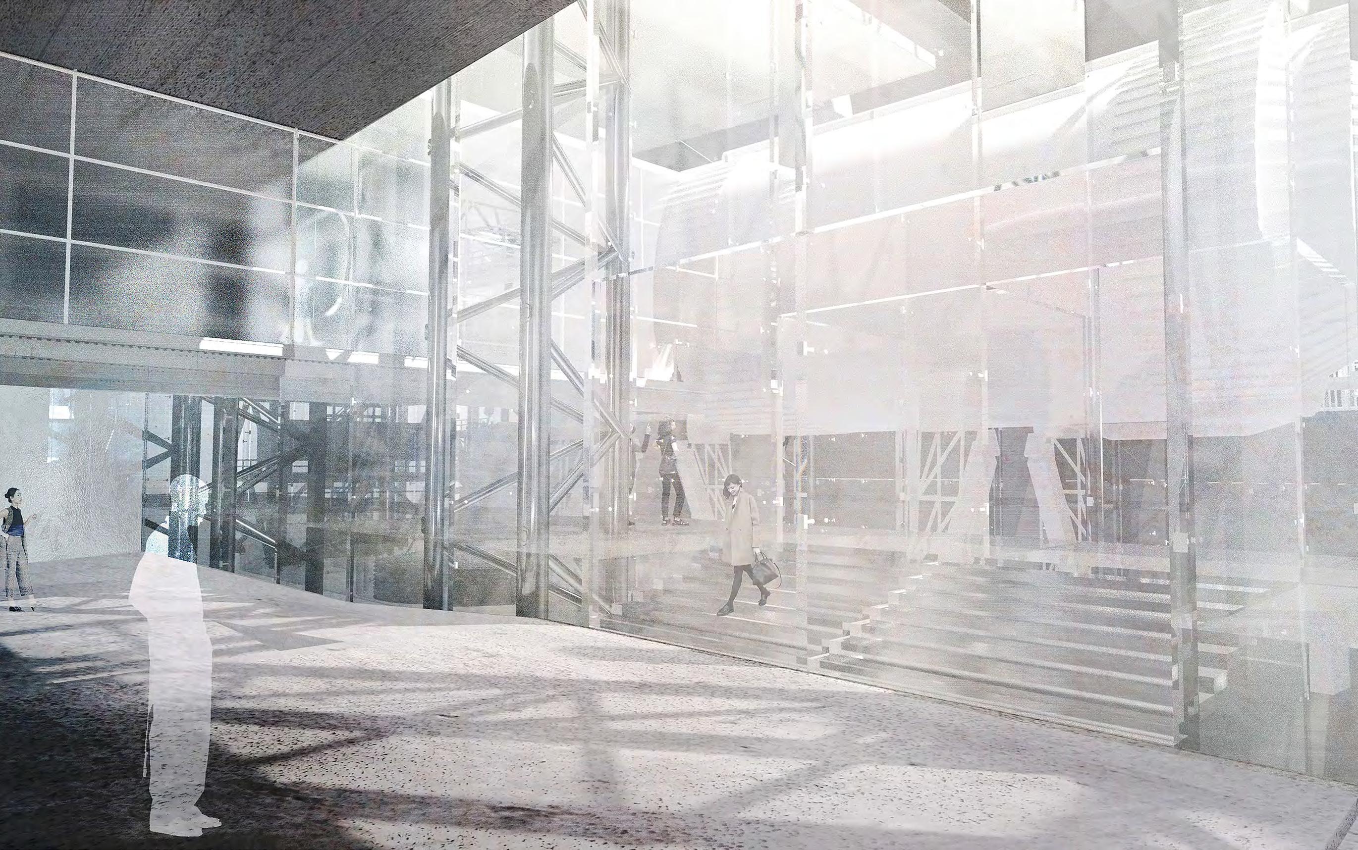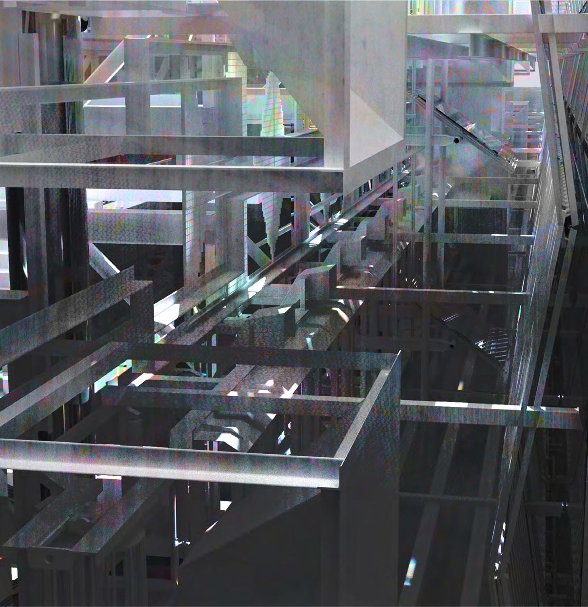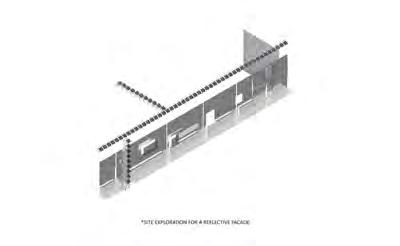 This facade seeks to encapsulate and negotiate the tectonic nature of reflection. A material that becomes the intermediary between the surrounding landscape and its operative skeleton. A complex system, something mechanical that breathes life and brings with it its own logic to hold dialogue with place and an internal monologue of its structure. The construct focuses on the hinge, tension, and rotation. Axial movements that break their rigidity when in conversation with each other and their surroundings. The facade is simplified as a surface and material, but finds its complexity in its framework and context.