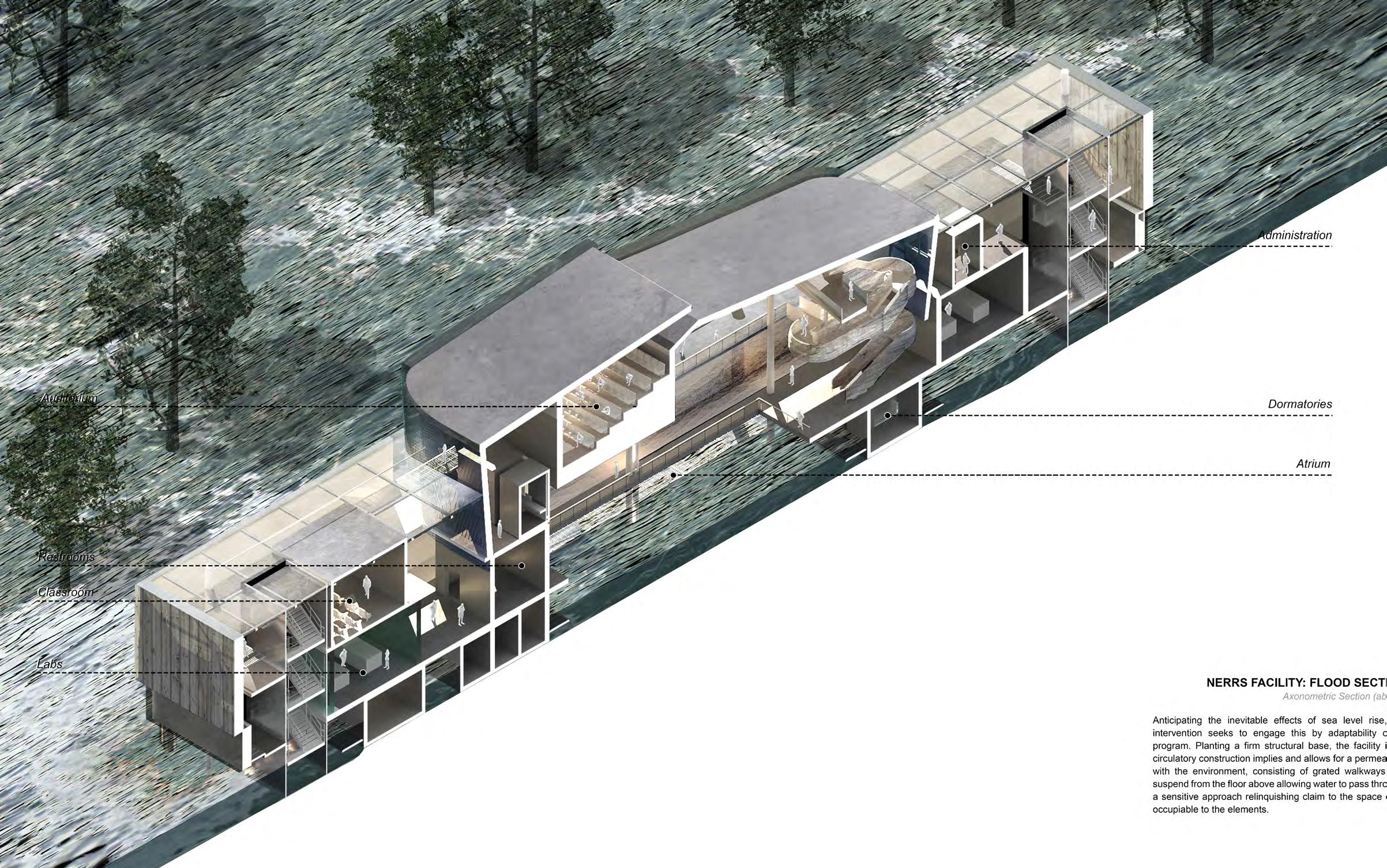 .Adapting to an inevitably encroaching sea, the facility orients to the site as to allow water to flow through it, forming a relationship that’s receptive and flexible to the shifting tides, juxtaposed to the current systems in place, opposing the elements. However, with consideration to this necessary approach of fortifying the edge, the facility serves as a testing grounds for utilizing a ‘natural infrastructure’ in response to rising sea levels and hurricane events. Addressing the impact
