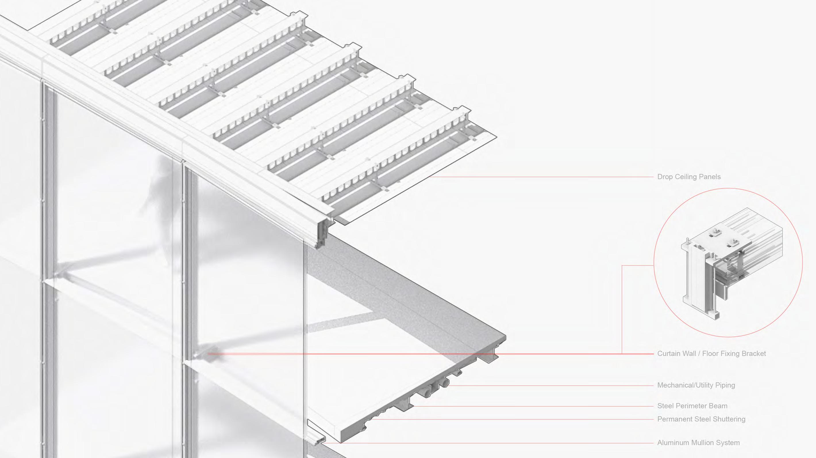 The metal and concrete frame of the glass curtain wall is hidden behind the glass panels, creating a seamless and uniform appearance. The frame is made of lightweight and durable materials, such as aluminum or steel, and is designed to support the weight of the glass panels while also providing structural stability. This sectional model outlines the structural assembly of the connecting glass facade of the lab facility to the workshop.