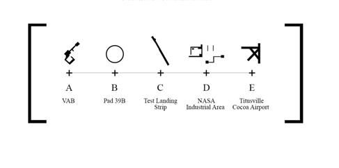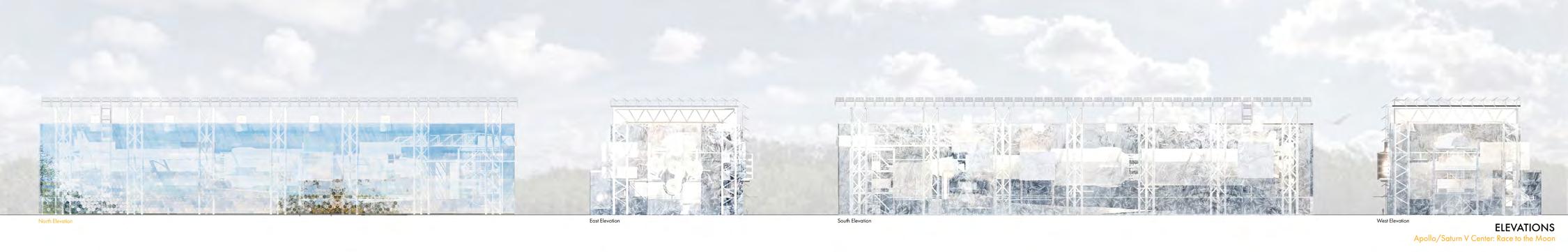 shuttle itself. Externally, this connection is carried through in the facade’s apertures, revealing fragments of Saturn V while mapping the relationships of these landmarks in the building. The entry ramp, guiding the occupant to the moon lander becomes reminiscent of a landing strip, entry points reflective of Titusville’s terminus’s, and programmatic organization following that of the VAB. Connections of a larger context to inform the intricacies of space.
