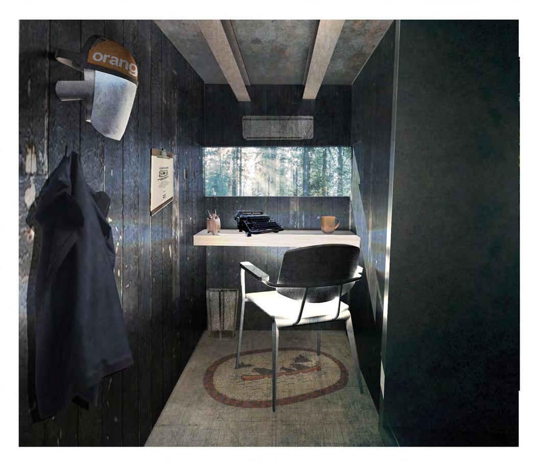 The lookout tower manifests from the old, encapsulating the original structure that registers with the mirrored lens that reflects out to the forest, symbolic of the purpose it once served. The morphosis of its structure adapts with its place, becoming a structure comprised of steel members at its foundation, but housing a traditionally wooden cab at its summit. Like its current state, in the result of a forest fire, the lookout follows a cycle of degradation, scorching the wooden structure that remains, leaving behind new remnants of an old standing structure, waiting to re-inhabited.
