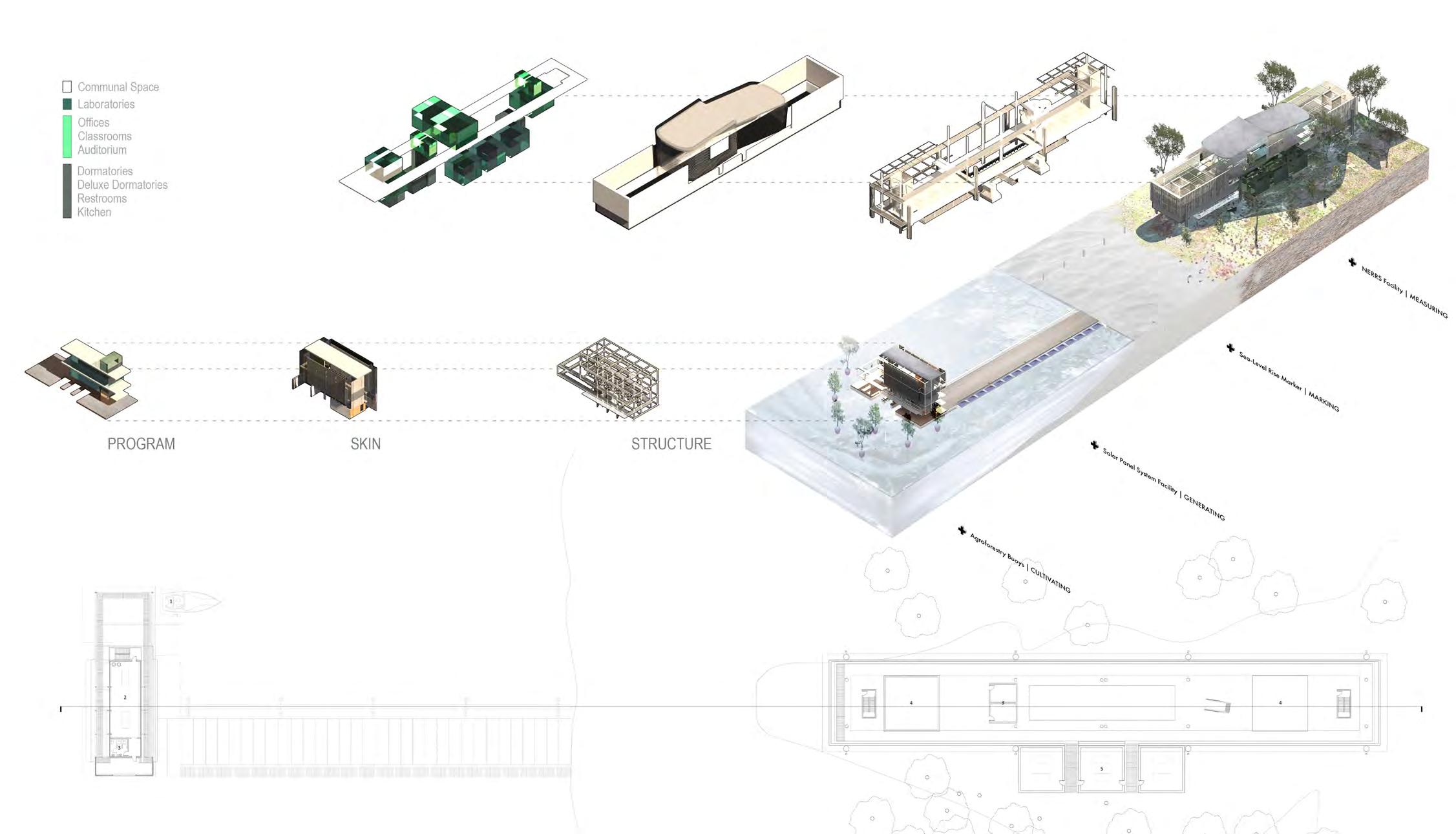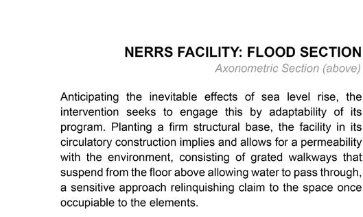 on / from vegetation along the coast, the facility splits the program both on shore and off-shore, while implementing a connection to vegetation in both contexts. Implementing the studies and mapping of the transect, the intervention explores methodologies of connecting, measuring, and testing conditions to an impermanent environment. Adaptive and permeable qualities become crucial to the longevity of this facility in its efforts to measure and engage the effects of sea level rise.