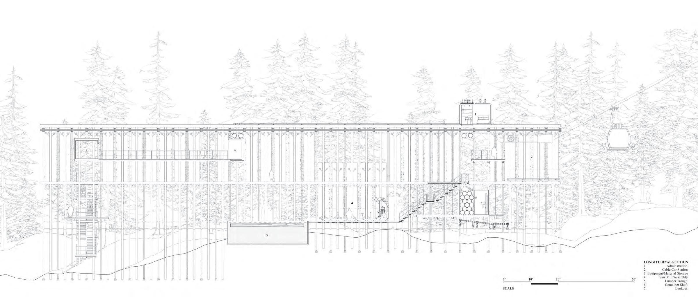 Through the logging process, in the aftermath of soaking the lumber for cutting, the rough cuts are hoisted up through pulley cables. This system serves two functions; for the foresters, it creates a wall on the second level circulation as protection from the elements while providing the lumber to dry and prevent pests and rotting to occur on the forest floor.