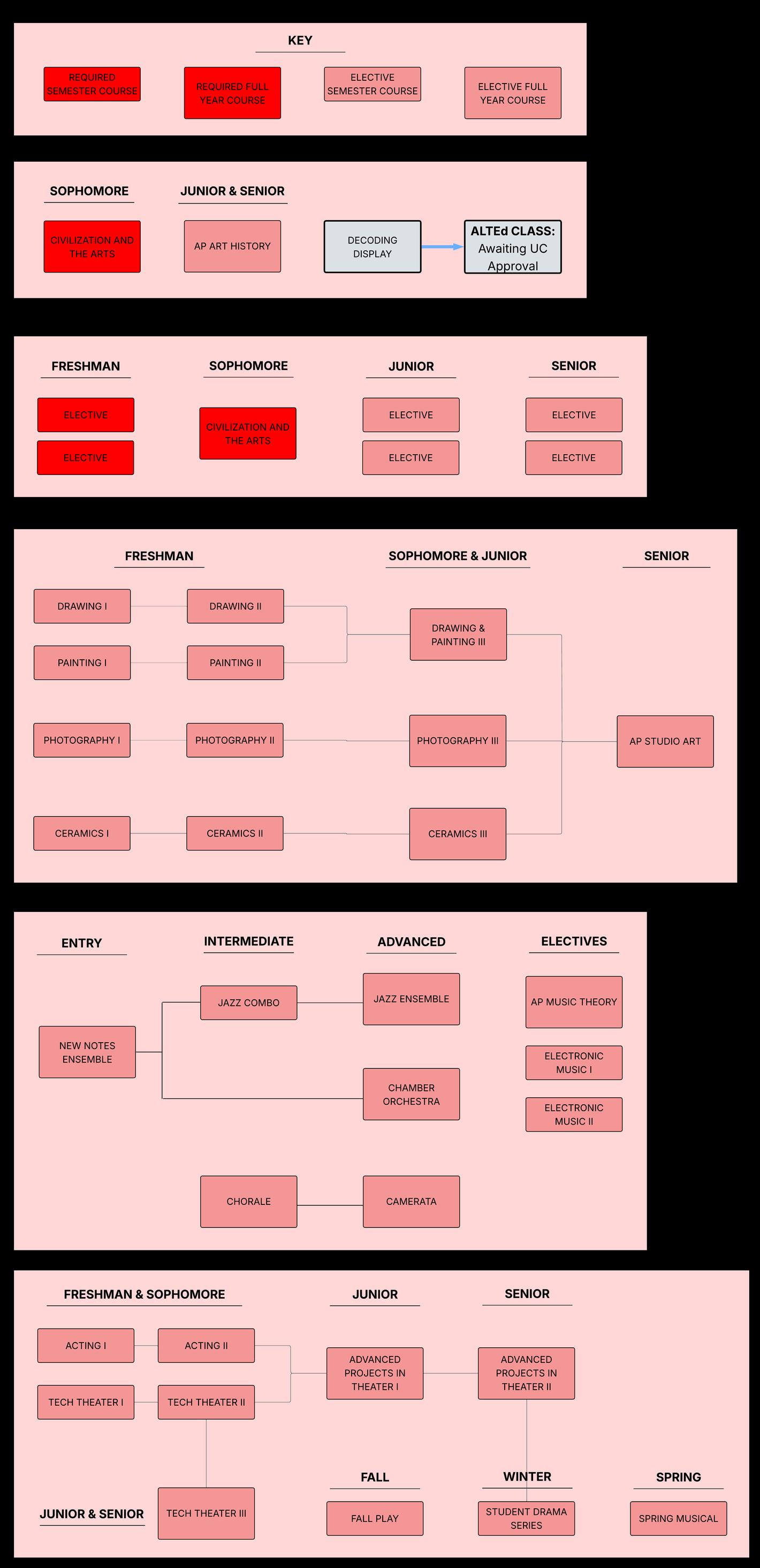 The Arts curriculum also offers a rich selection of studio and performing courses in Visual Arts, Music, and Theater and focuses on building skills which will enable students to fulfill their creative visions. Students may take any entry-level course in the three disciplines as well as pursue greater depth and skill development through upper level courses such as the level III Studio courses, the upper division performing ensembles, AP Studio Art, Advanced Projects in Theater II, AP Music Theory and AP Art History.