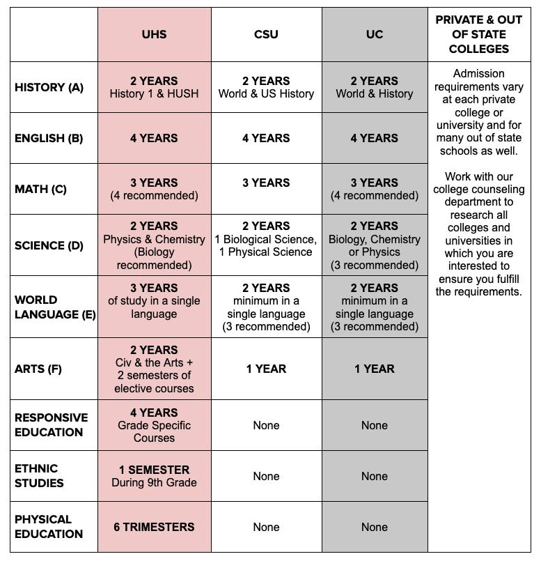 The requirements below represent the minimum coursework necessary to earn a University High School diploma In practice, many students exceed these minimums as they pursue advanced courses and areas of personal interest