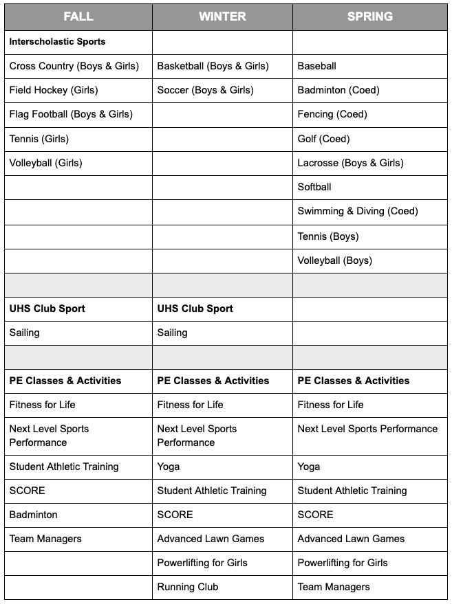 UHS operates on a trimester system aligned with the athletic seasons: fall, winter, and spring. Students must fulfill one Physical Education (PE) requirement per trimester for two years, for a total of six trimesters.