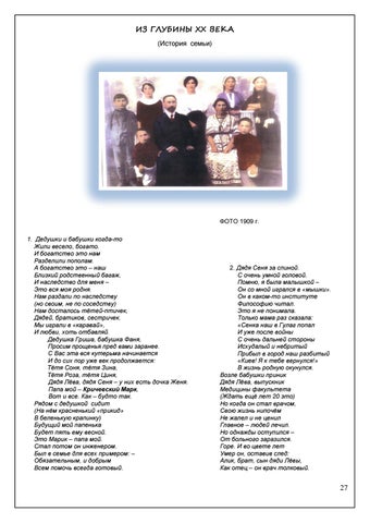 ФОТО 1909 г. 1. Дедушки и бабушки когда-то Жили весело, богато. И богатство это нам Разделили пополам. А богатство это – наш Близкий родственный багаж, И наследство для меня – Это вся моя родня. Нам раздали по наследству (но своим, не по соседству) Нам досталось тётей-птичек, Дядей, братиков, сестричек. Мы играли в «каравай», И любви, хоть отбавляй. Дедушка Гриша, бабушка Фаня, Просим прощенья пред вами заранее. С Вас эта вся кутерьма начинается И до сих пор уже век продолжается: Тётя Соня, тётя Зина, Тётя Роза, тётя Циня, Дядя Лёва, дядя Сеня – у них есть дочка Женя. Папа мой – Кричевский Марк, Вот и все. Как – будто так. Рядом с дедушкой сидит (На нём красненький «прикид» В беленькую крапинку) Будущий мой папенька Будет пять ему весной. Это Марик – папа мой. Стал потом он инженером. Был в семье для всех примером: – Обязательным, и добрым Всем помочь всегда готовый.