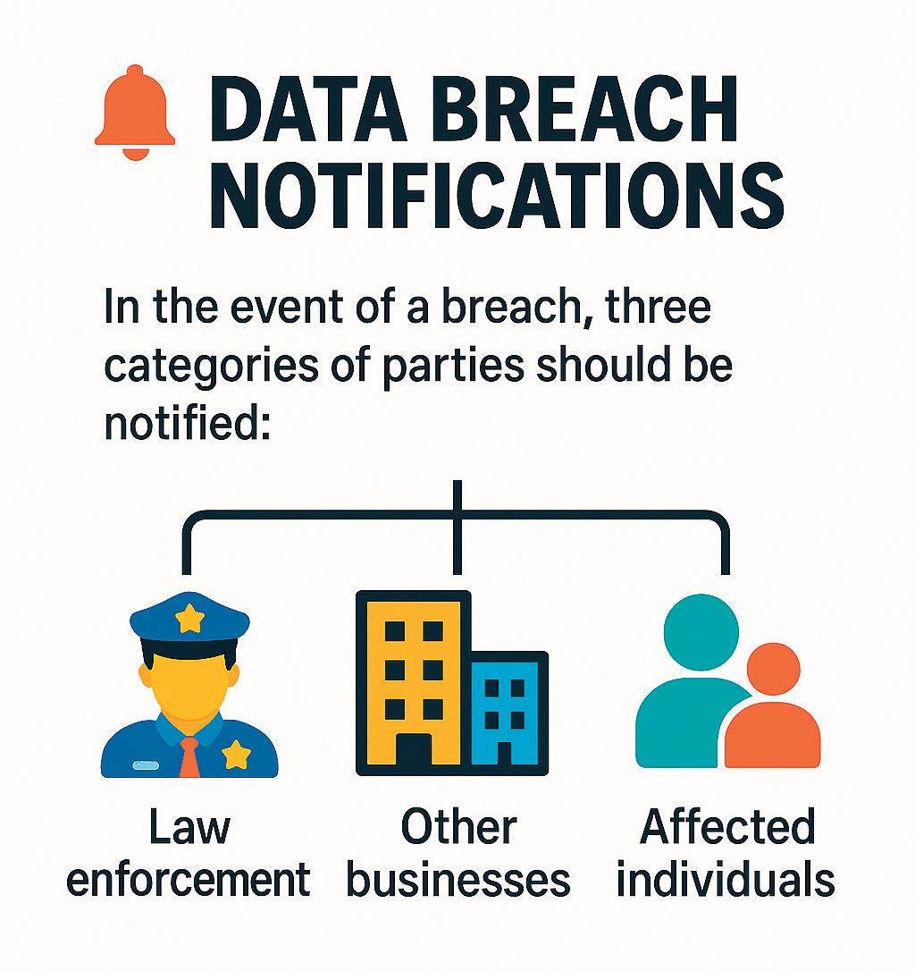 In the event of a breach, three categories of parties should be notified: law enforcement, other businesses and affected individuals. In addition to the parties noted above, CPAs should explicitly consider the legal requirements regarding data breach notification under applicable state and federal laws.