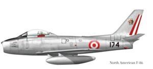 Avión de caza a reacción fabricado por North American Aviation, desarrollado a fines de los años 1940. El Perú adquirió un total de veinte (20) F86-F, versión caza bombardero con motor más potente y diversas mejoras. Armamento: 6 ametralladoras M2 Browning de calibre 12.7mm (.50) en el morro con 1,602 proyectiles en total. Puntos de anclaje: 4 soportes externos con una capacidad de 2,400 kg, para cargar una combinación de BombasCohetes.Dadosdebajaen1979.