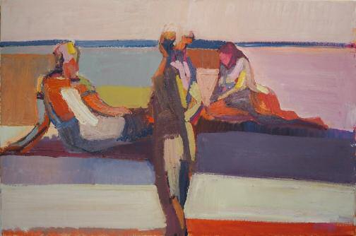 “Many of my painting s invoke feeling s of solitude or e ven loneliness. e fig ures appear connected but oen seem to be looking away from one another, absorbed in their own lives and stories, perhaps occasionally connecting , perhaps not, like strang ers in the same scene. At other times, fig ures seem to be waiting for someone to arrive or for an activit y to beg in, anticipating a meeting or a reunion for instance. Whate ver the circumstances, there's always an outcome awaiting discover y.