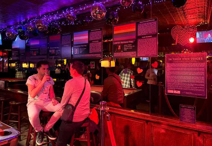der Pride flag sits on the back wall facing the entrance, acting as both a centerpiece and an unequivocal sign of support and acknowledgement of its roots.