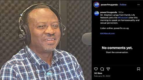 Watoto’s X account shared a talk Langa did about the immorality of homosexuality in 2017. In a 2021 livestream of a church sermon by President Rwotlonyo on Watoto’s Facebook account, Langa leads a prayer asking God to guide Uganda through its “dark political times.” In February 2022, PowerFMUganda made a promotional post on Instagram with Langa as a guest to “speak on homosexuality and sexual perversion.”
