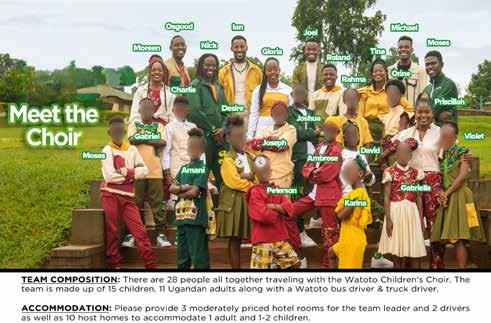 In the online “Watoto Planning Packet: Better Days Tour West Coast 2025,” the organization requests its US hosts only provide “moderately priced” hotel rooms for its two drivers and team leader, asking that “10 host homes” be arranged for its child performers and other adults for lodging. The packet reports members of “Choir 120” by name: 13 adults and 11 children aged 7-13 years old, with 1-2 children assigned per one chaperone.