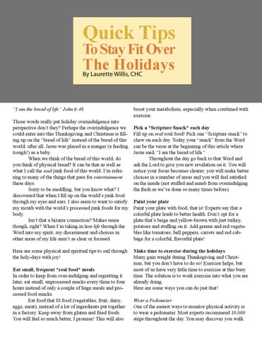 The Holidays By Laurette Willis, CHC “I am the bread of life” John 6:48 Those words really put holiday overindulgence into perspective don’t they? Perhaps the overindulgence we could enter into this Thanksgiving and Christmas is filling up on the “bread of life” instead of the bread of this world; after all, Jesus was placed in a manger (a feeding trough!) as a baby. When we think of the bread of this world, do you think of physical bread? It can be that as well as what I call the soul junk food of this world. I’m referring to many of the things that pass for entertainment these days. Sorry to be meddling, but you know what? I discovered that when I fill up on the world’s junk food through my eyes and ears, I also seem to want to satisfy my mouth with the world’s processed junk foods for my body. Isn’t that a bizarre connection? Makes sense though, right? When I’m taking in less life through the Word into my spirit, my discernment and choices in other areas of my life aren’t as clear or focused. Here are some physical and spiritual tips to sail through the holy-days with joy! Eat small, frequent *real food* meals In order to keep from over-indulging and regretting it later, eat small, unprocessed snacks every three to four hours instead of only a couple of huge meals and processed food snacks. Eat food that IS food (vegetables, fruit, dairy, eggs, meat), instead of a lot of ingredients put together in a factory. Keep away from gluten and fried foods. You will feel so much better, I promise! This will also