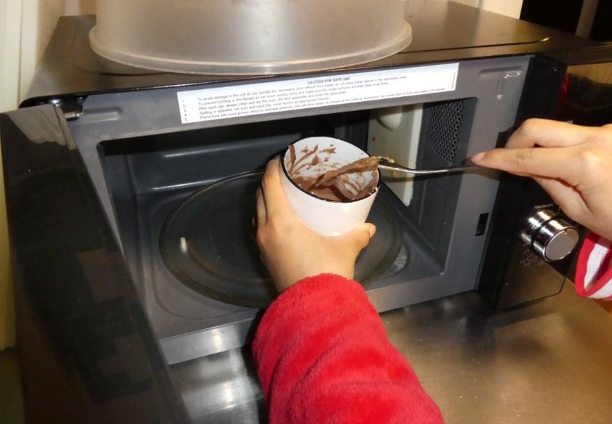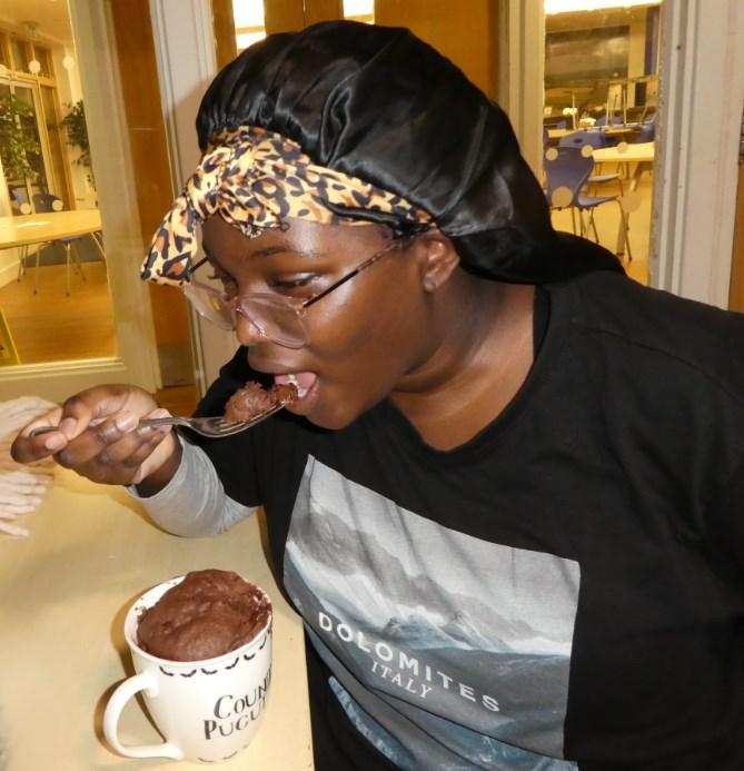 Mrs Franks gathered a small crowd of students eager to see if the legendary “mug cake” was actually a real thing. Armed with a variety of ingredients, a recipe book and, of course, the all important mugs, they began to mix and stir. The “mix in the cup” method created very little mess and soon the microwave was happily humming away.