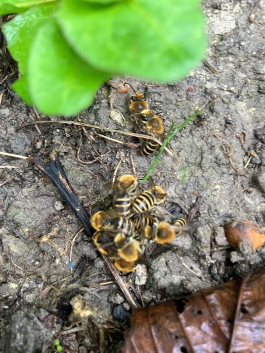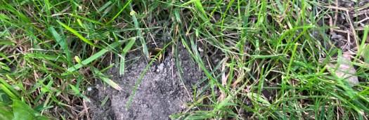Sunny weather heralded the yearly return of our colony of Miner Bees. These are basically harmless and rarely fly more that a few inches above the ground when nesting. Each bee digs a small tunnel to lay eggs, from which they get their name. In a few months the eggs will hatch into larvae which in turn will become the next generation of miner bees destined to return the year after.