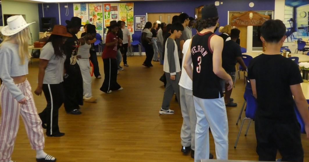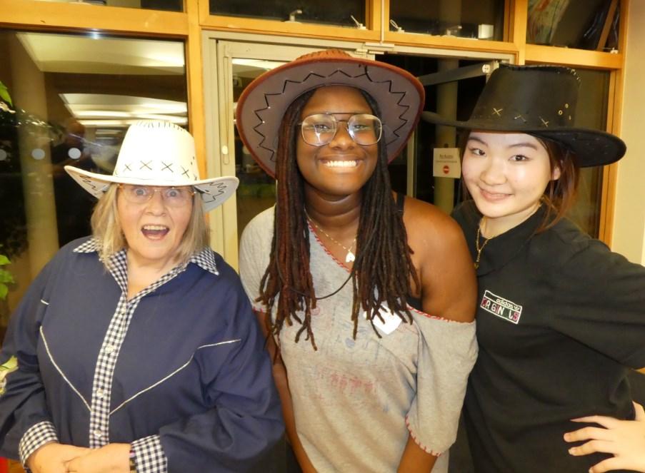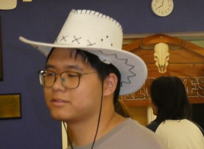 We generally alternate between salsa and line dancing each year. This year…. Line Dancing with Stetson hats and inflatable horses. The ladies who run this for us teach the students a number of steps that combine into a number of dances. Everyone has a go, with some showing more talent than others, and a few staying for the more advanced styles at the end.
