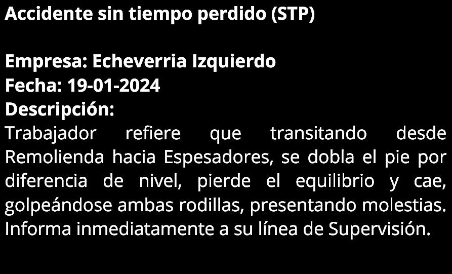 Trabajador refiere que transitando desde Remolienda hacia Espesadores, se dobla el pie por diferencia de nivel, pierde el equilibrio y cae, golpeándose ambas rodillas, presentando molestias. Informa inmediatamente a su línea de Supervisión.