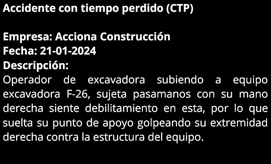 Operador de excavadora subiendo a equipo excavadora F26, sujeta pasamanos con su mano derecha siente debilitamiento en esta, por lo que suelta su punto de apoyo golpeando su extremidad derecha contra la estructura del equipo