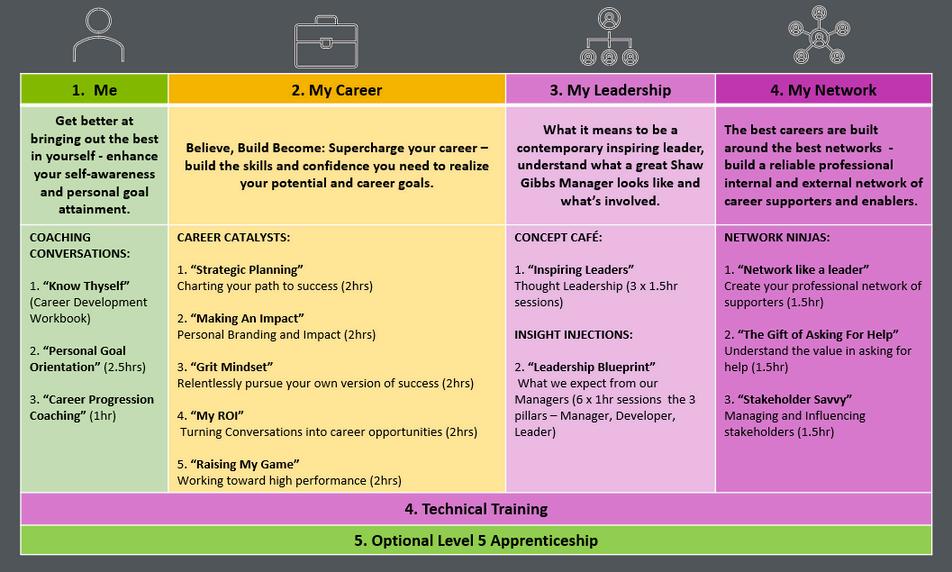 Phasetwooffersknowledgeandskilldevelopment, focussingonourexpectationsofourmanagersat Shaw Gibbs and eploration of foundational managementtheoriesandskills Inaddition,we’ve createdpracticalworkshopsforunlockingsuccess; a series of tool based workshops to help reach yourcareergoals